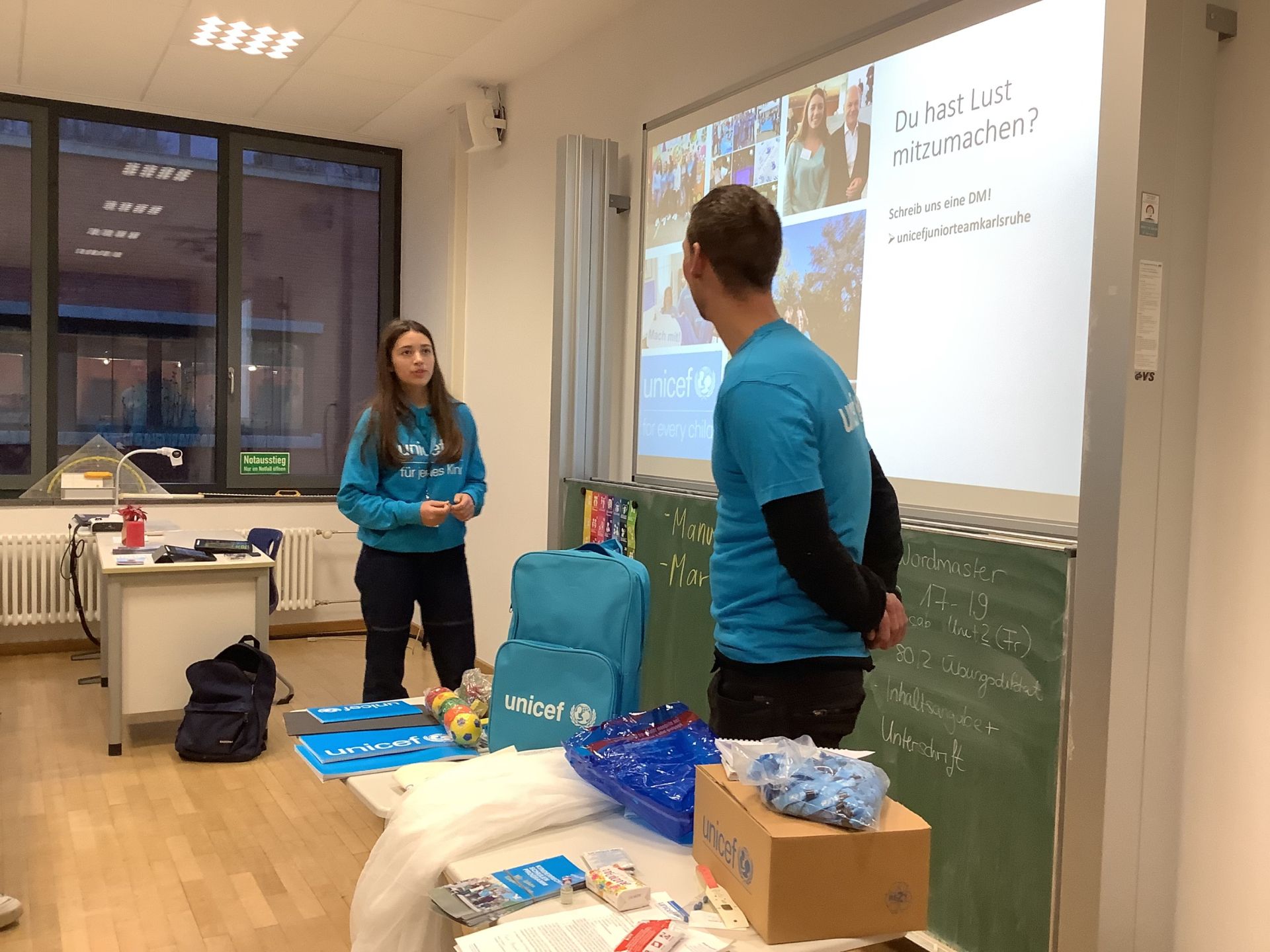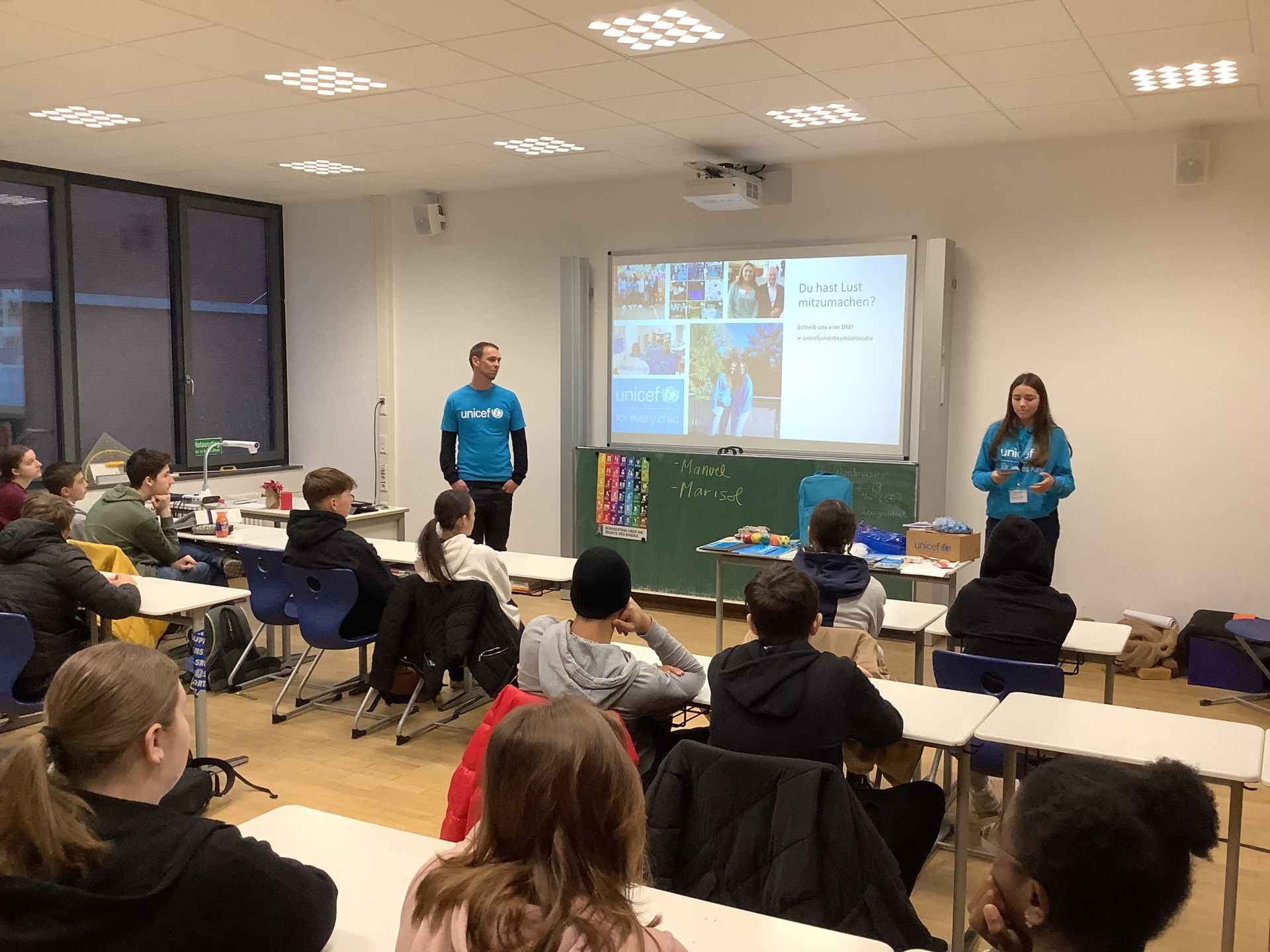 Dezember 2022 - Wir hatten die ehemalige Schülerin Marisol zu Gast. Marisol und Manuel engagieren sich ehrenamtlich für Unicef und haben in der 9b einen Vortrag zum Thema Kinderrechte gehalten. Anlass dafür war der 12.12. (Tag der Menschenrechte). Die Kinderrechte sind leider immer noch nicht im Grundgesetz verankert, umso wichtiger ist, dass wir unsere Schülerinnen und Schüler darüber aufklären.
