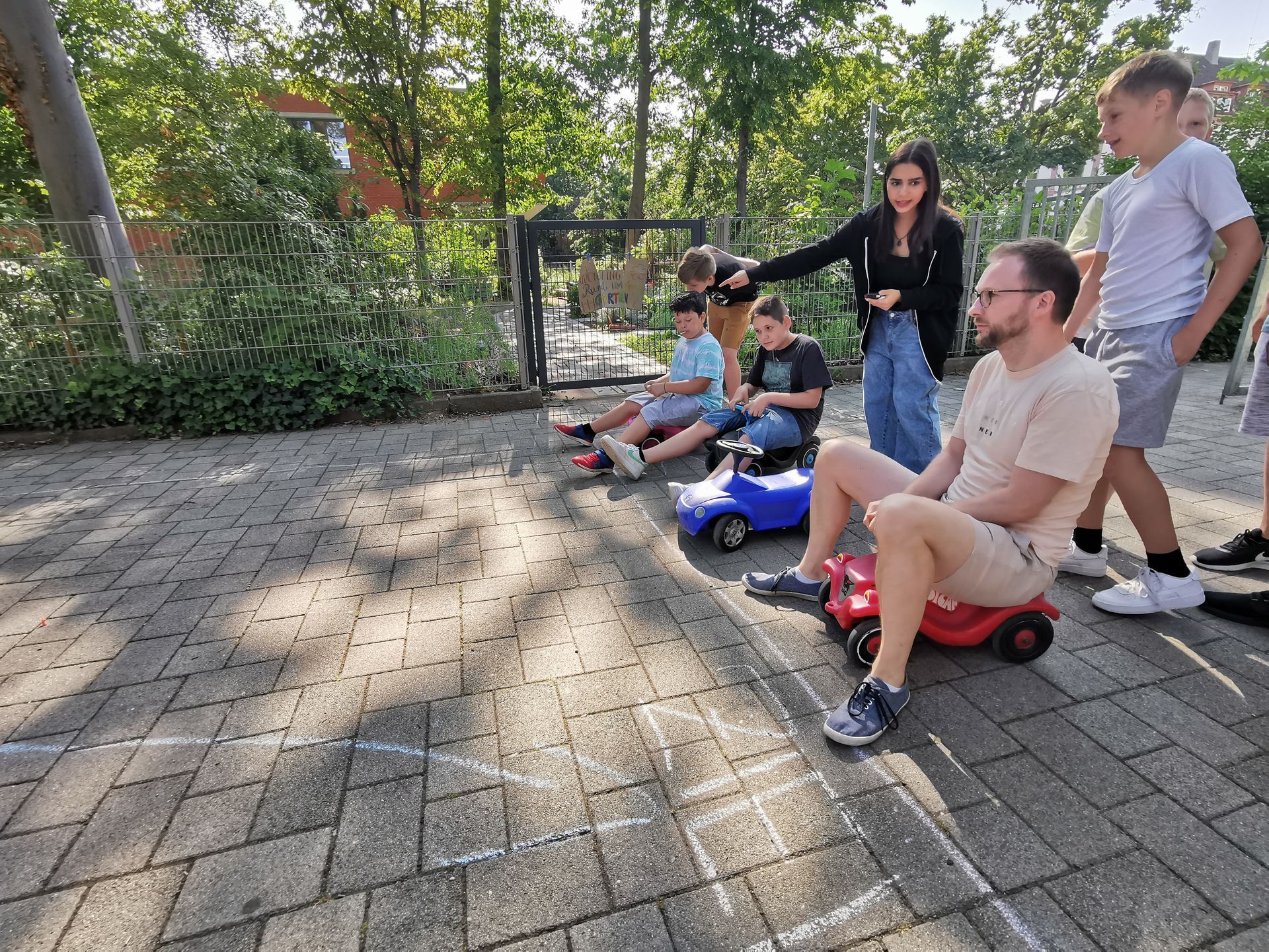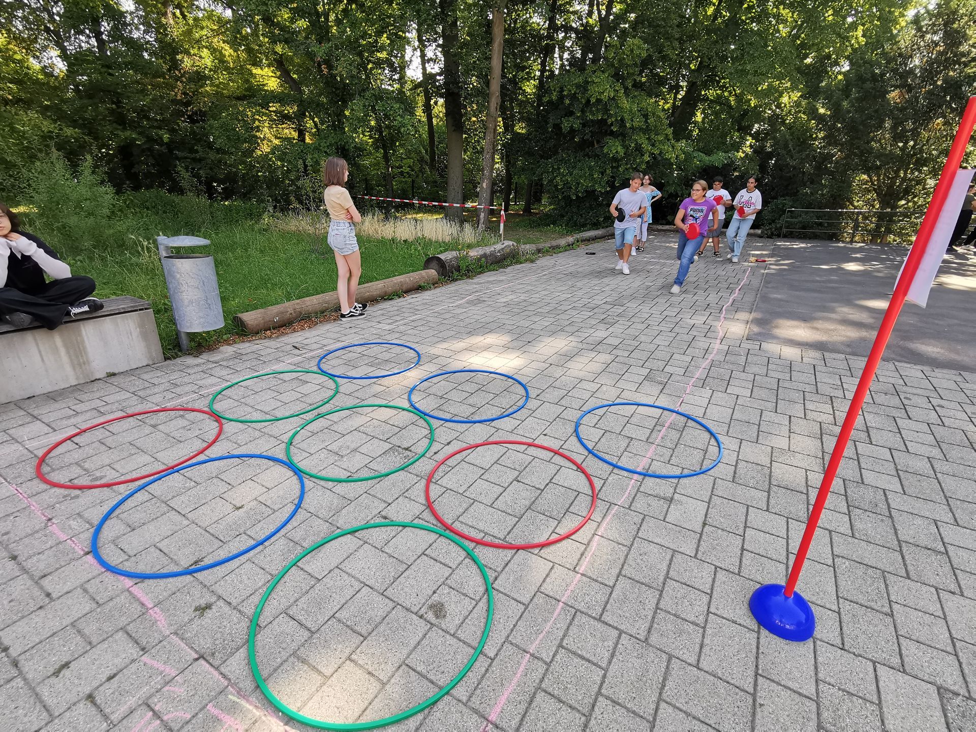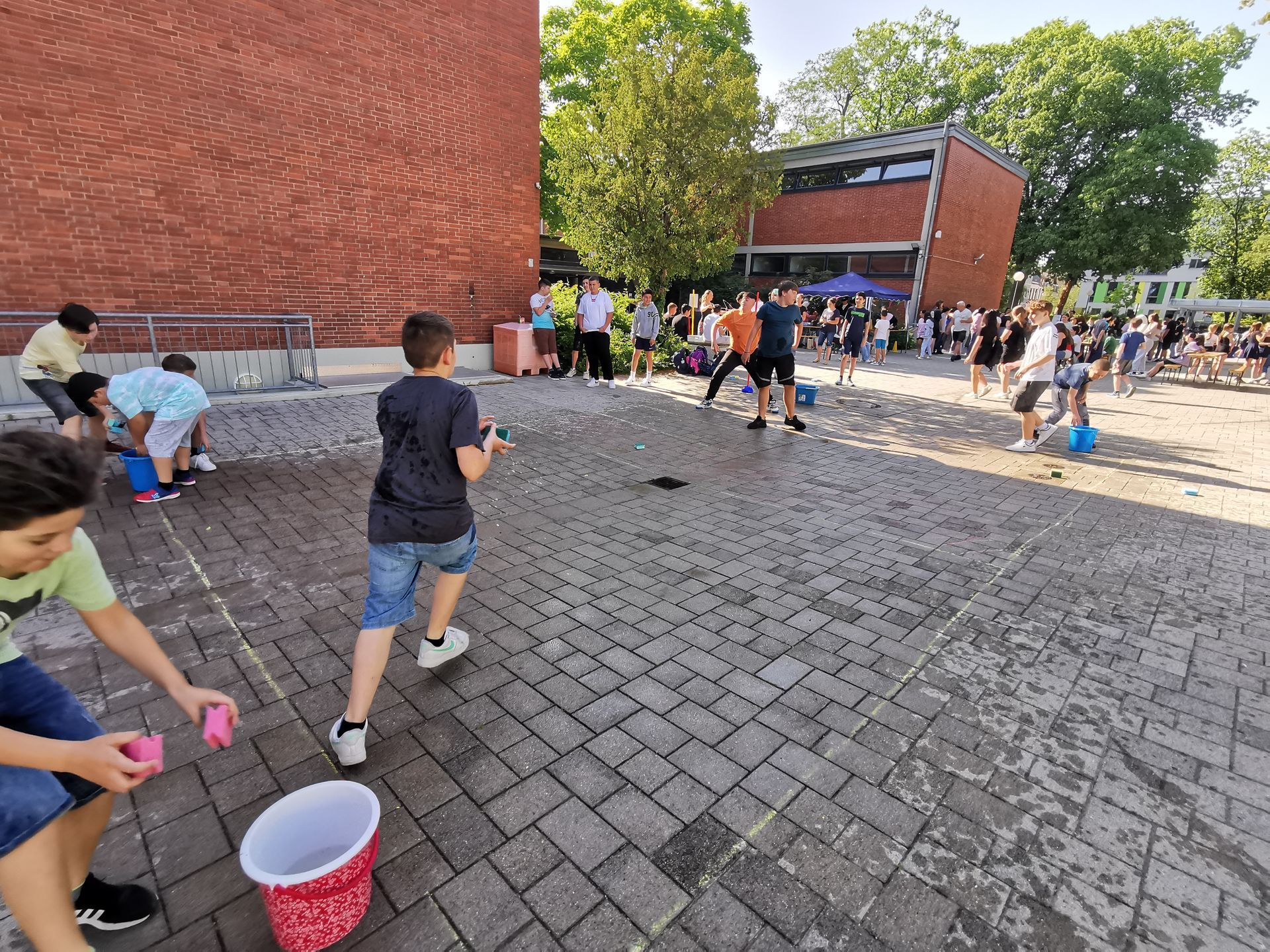 An zehn Stationen gab es Spiele: unter anderem Wasserschwammschlacht, Bobbycar-Rennen, Tauziehen und Speed-TicTacToe. Auch die Lehrer*innen machten unter vollem Einsatz mit. Für ein Päuschen zwischendurch blieben beim Getränke- und Eisverkauf kaum Wünsche offen. Begleitet wurde das Spektakel von einer toll zusammengestellten Sommerplaylist. Gegen Ende gab es dann auch kein Halten mehr, man tanzte gemeinsam in Richtung Wochenende.