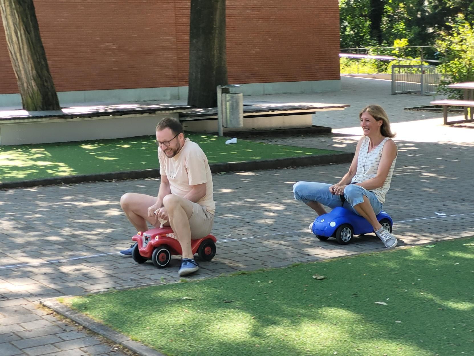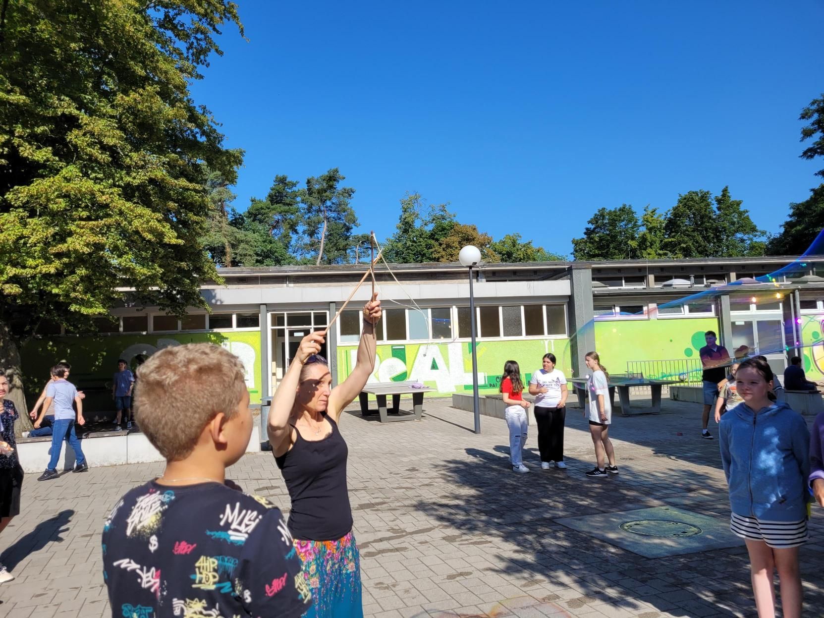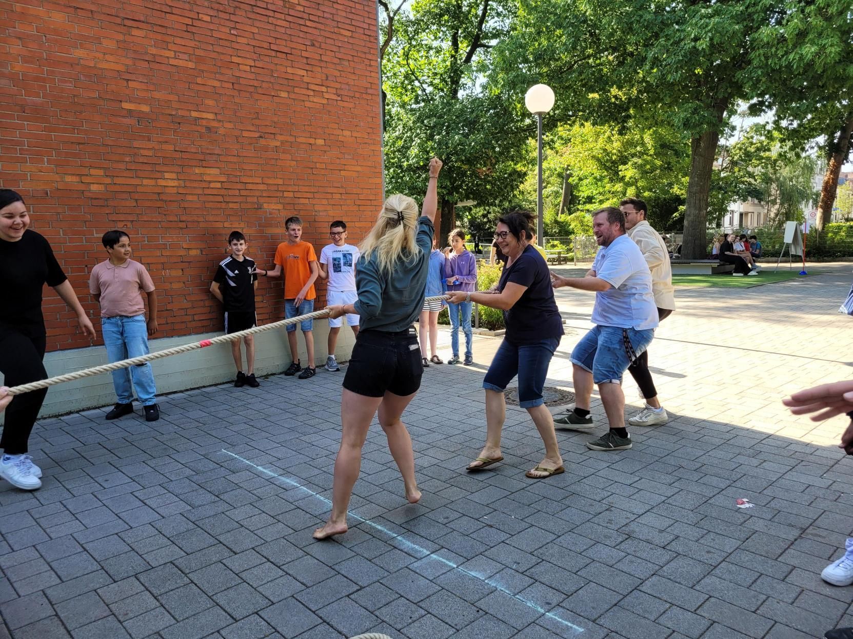 An zehn Stationen gab es Spiele: unter anderem Wasserschwammschlacht, Bobbycar-Rennen, Tauziehen und Speed-TicTacToe. Auch die Lehrer*innen machten unter vollem Einsatz mit. Für ein Päuschen zwischendurch blieben beim Getränke- und Eisverkauf kaum Wünsche offen. Begleitet wurde das Spektakel von einer toll zusammengestellten Sommerplaylist. Gegen Ende gab es dann auch kein Halten mehr, man tanzte gemeinsam in Richtung Wochenende.