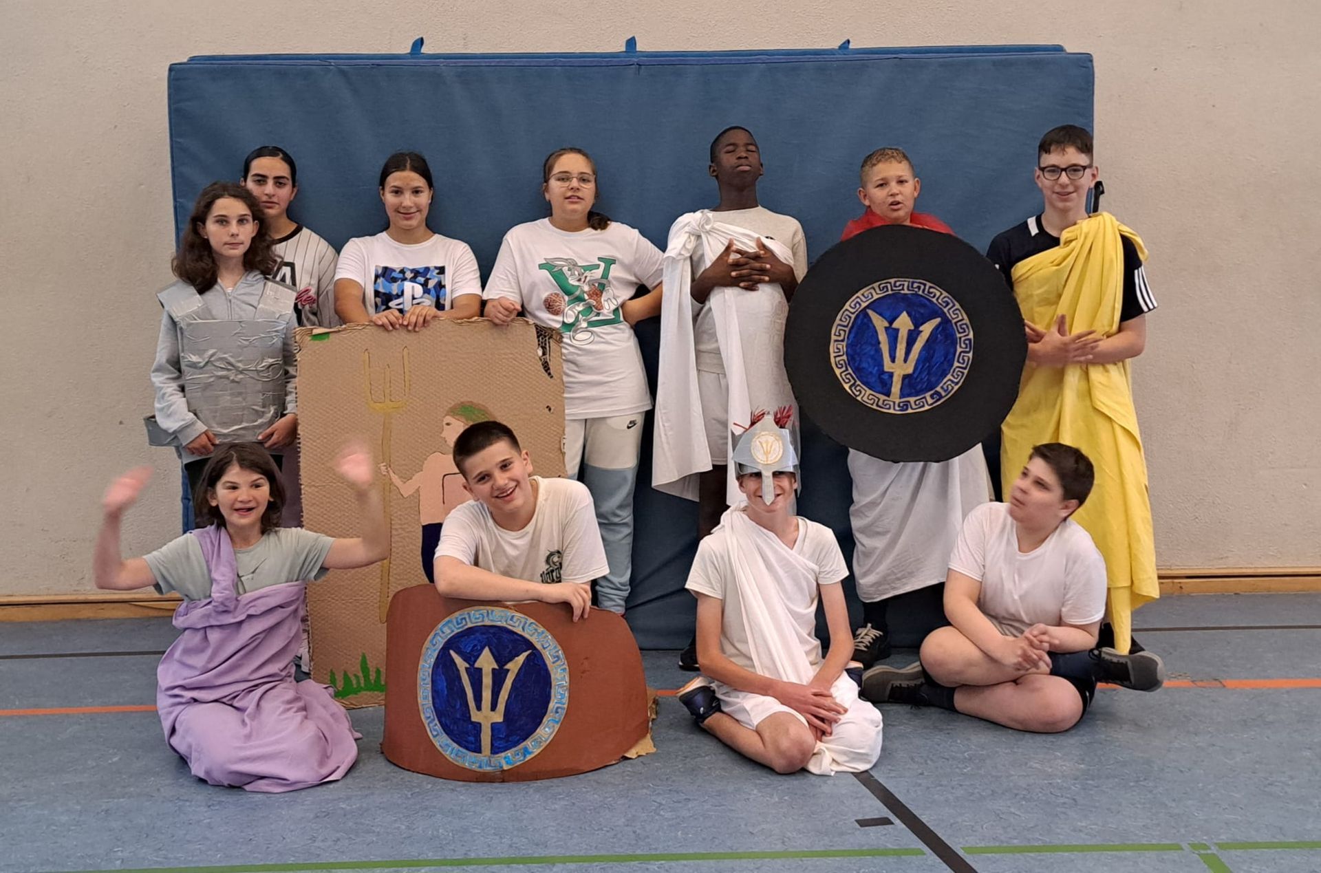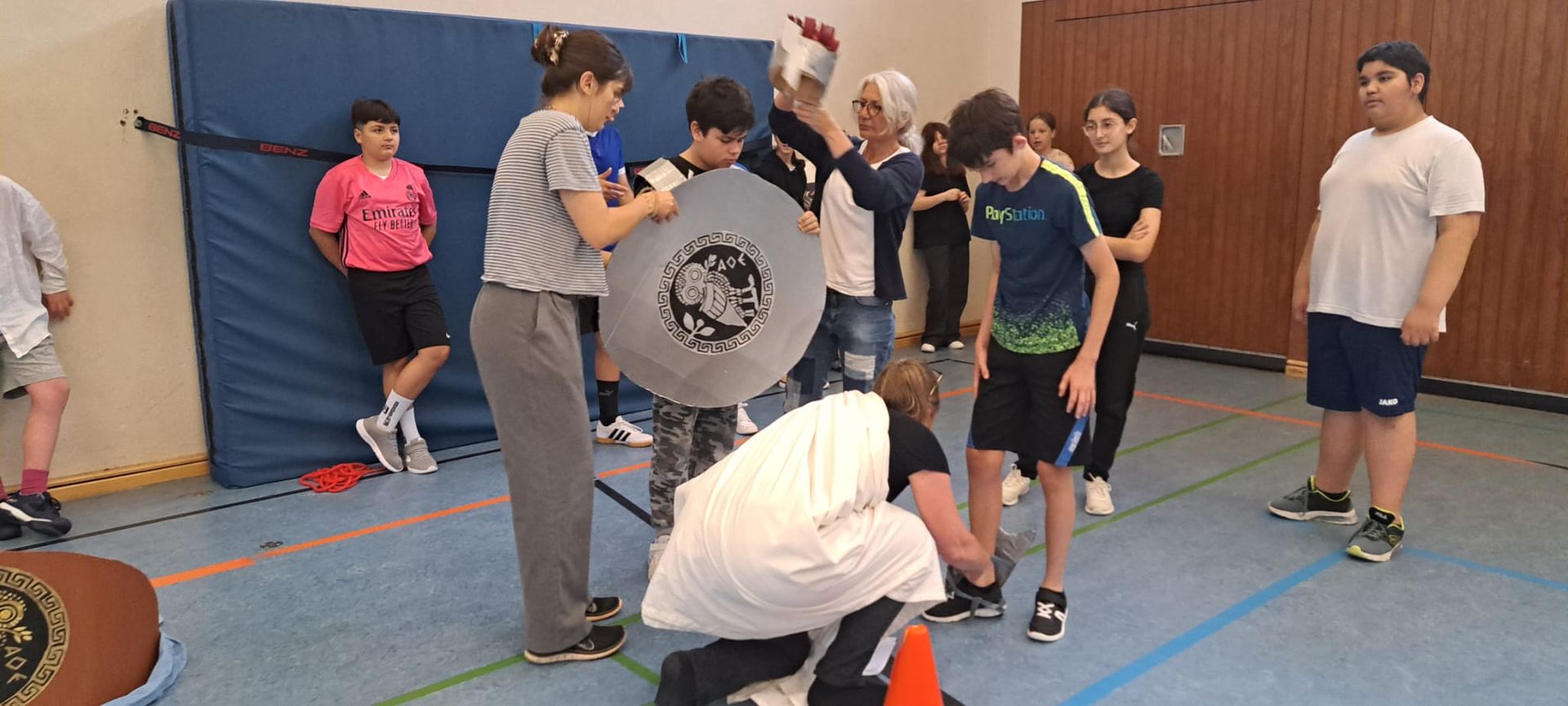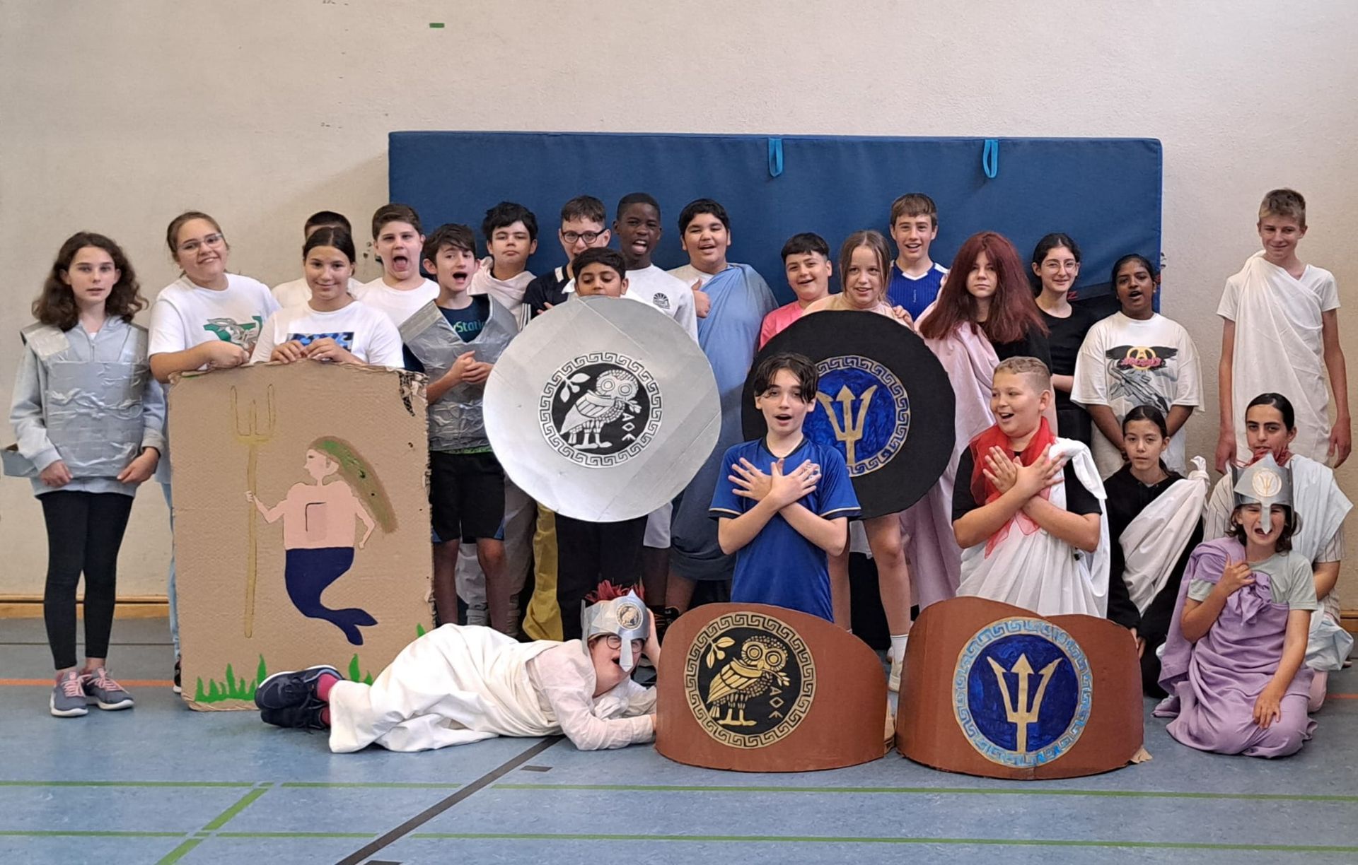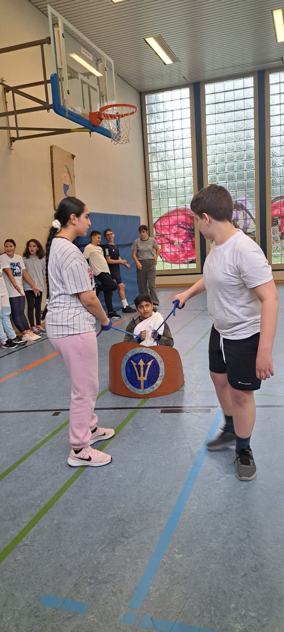 In Deutsch bei Frau Wacker haben wir die Abenteuer des Odysseus gelesen. Das Buch war spannend. Und wir haben einen Rap darüber geschrieben. Passend bauen wir in Technik bei Herrn Breunig griechische Krieger-Schiffe. Es ist anstrengend, aber auch lustig.