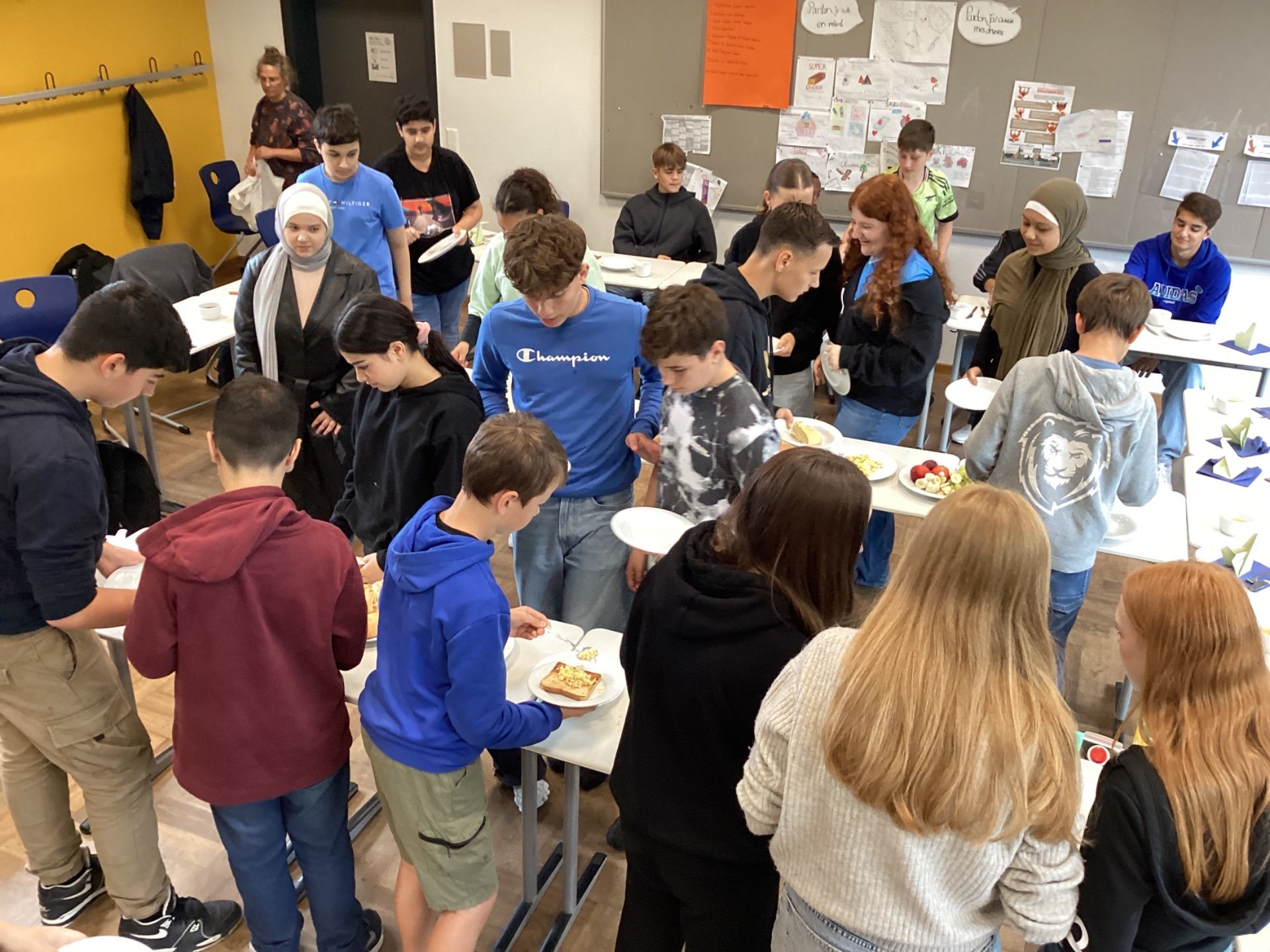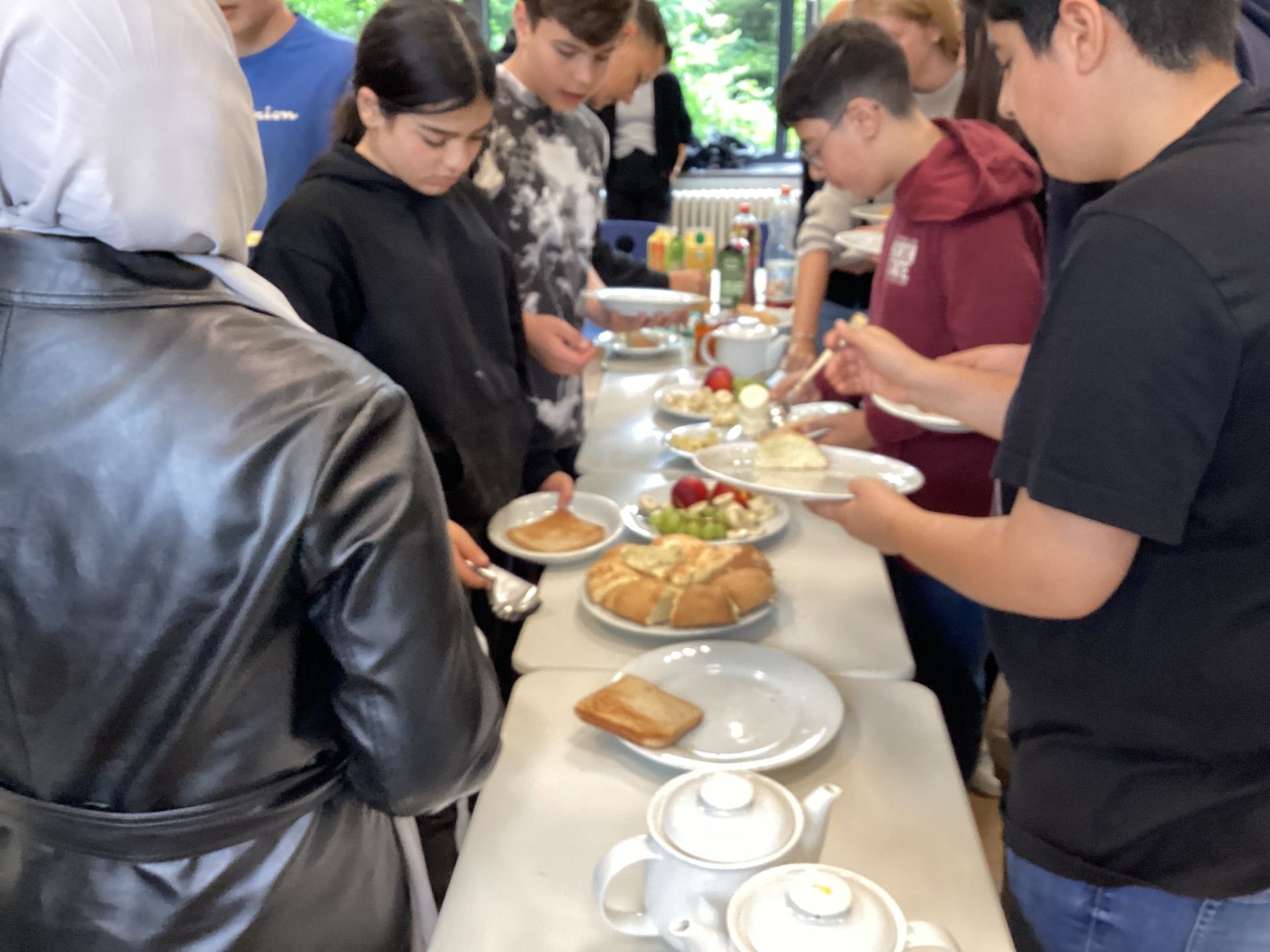 Juli 2024 - Nachdem die Klasse 7b dieses Schuljahr viel über die Britischen Inseln im Englischunterricht gelernt hat, gab es noch einen krönenden Abschluss: In Kooperation der Fächer AES und Englisch haben die Schüler*innen englische Rezepte rausgesucht. Es wurde gekocht, gebacken und angerichtet um es sich dann gemeinsam schmecken zu lassen - die Musik dazu war natürlich “totally British“. Was für ein leckerer und lustiger Vormittag!