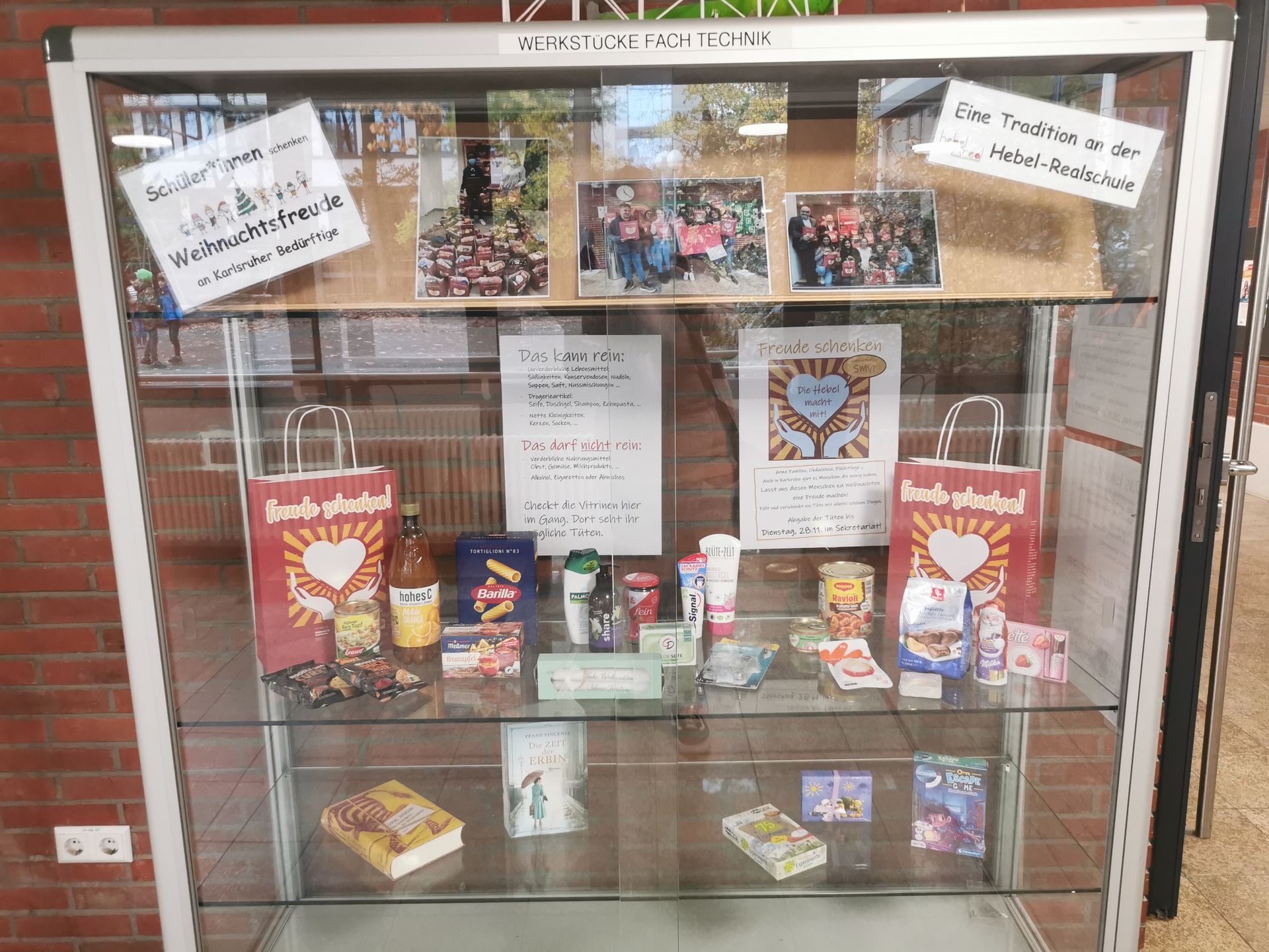Anfang Dezember wurden etwa 90 toll gepackte Tüten für die Aktion "Freude schenken" der Diakonie Karlsruhe übergeben. Die Wochen zuvor machte die SMV ordentlich Werbung in der Schule dafür, auch eine Überraschungstüte mit allerlei Nützlichem und Schönem an Bedürftige in der Weihnachtszeit zu spenden.