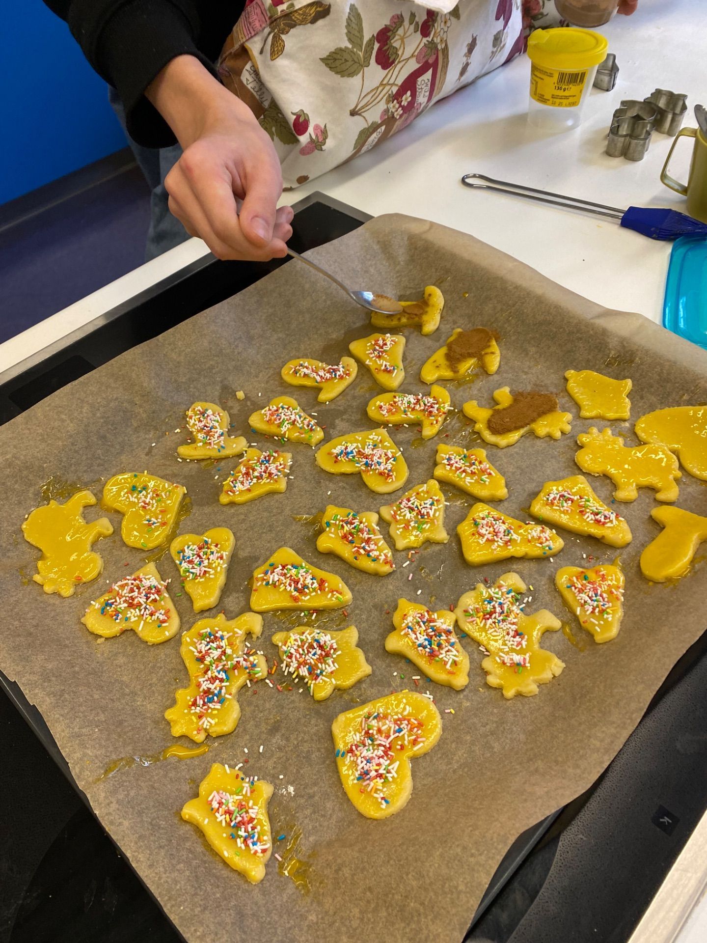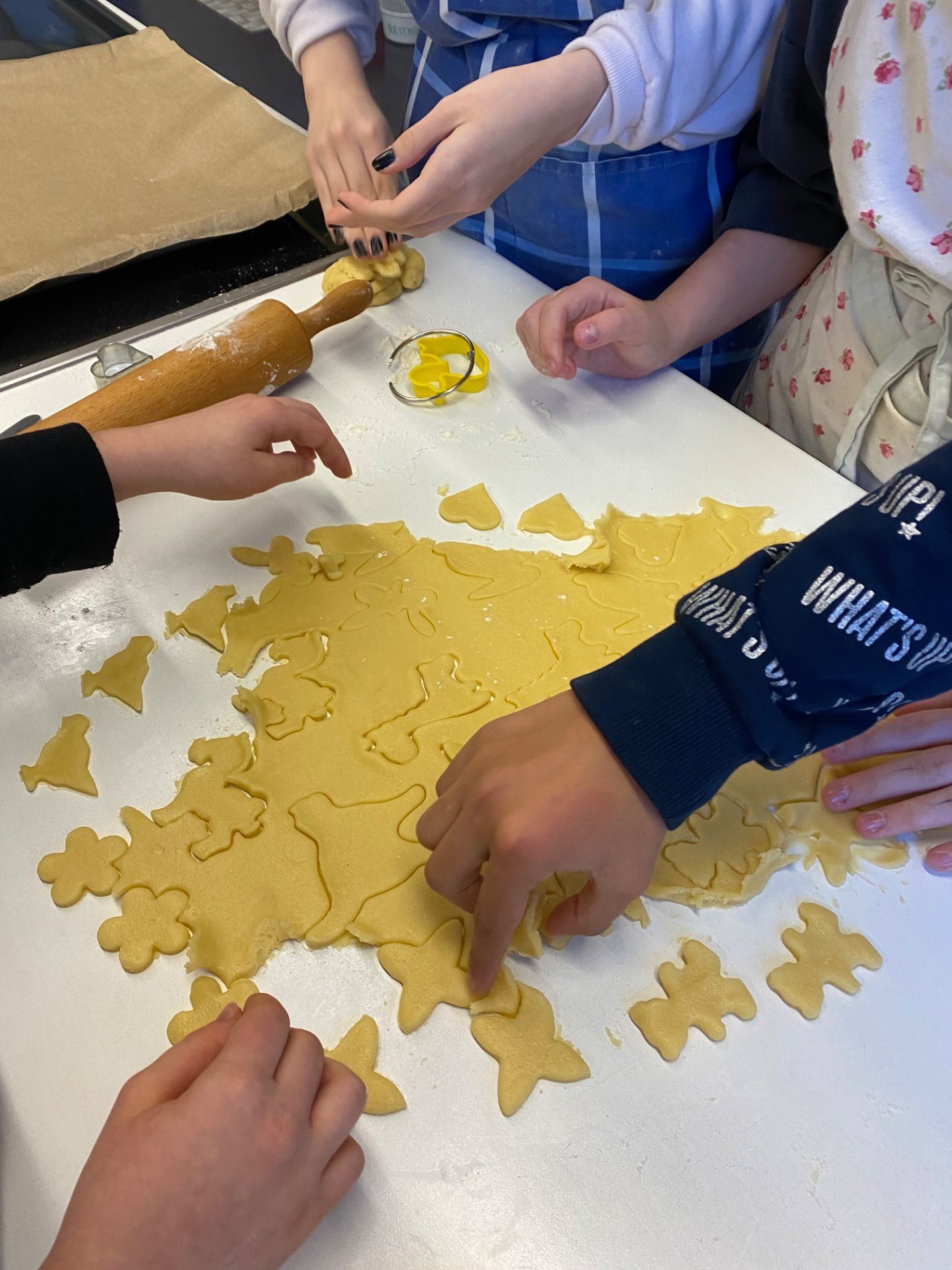 Dank mancher Schüler, die schon zu Hause die Teige vorbereitet hatten, gestalteten die Kinder in Gruppen in Windeseile schöne weihnachtliche, aber auch lustige Plätzchen, die dann im Ofen gebacken wurden.
