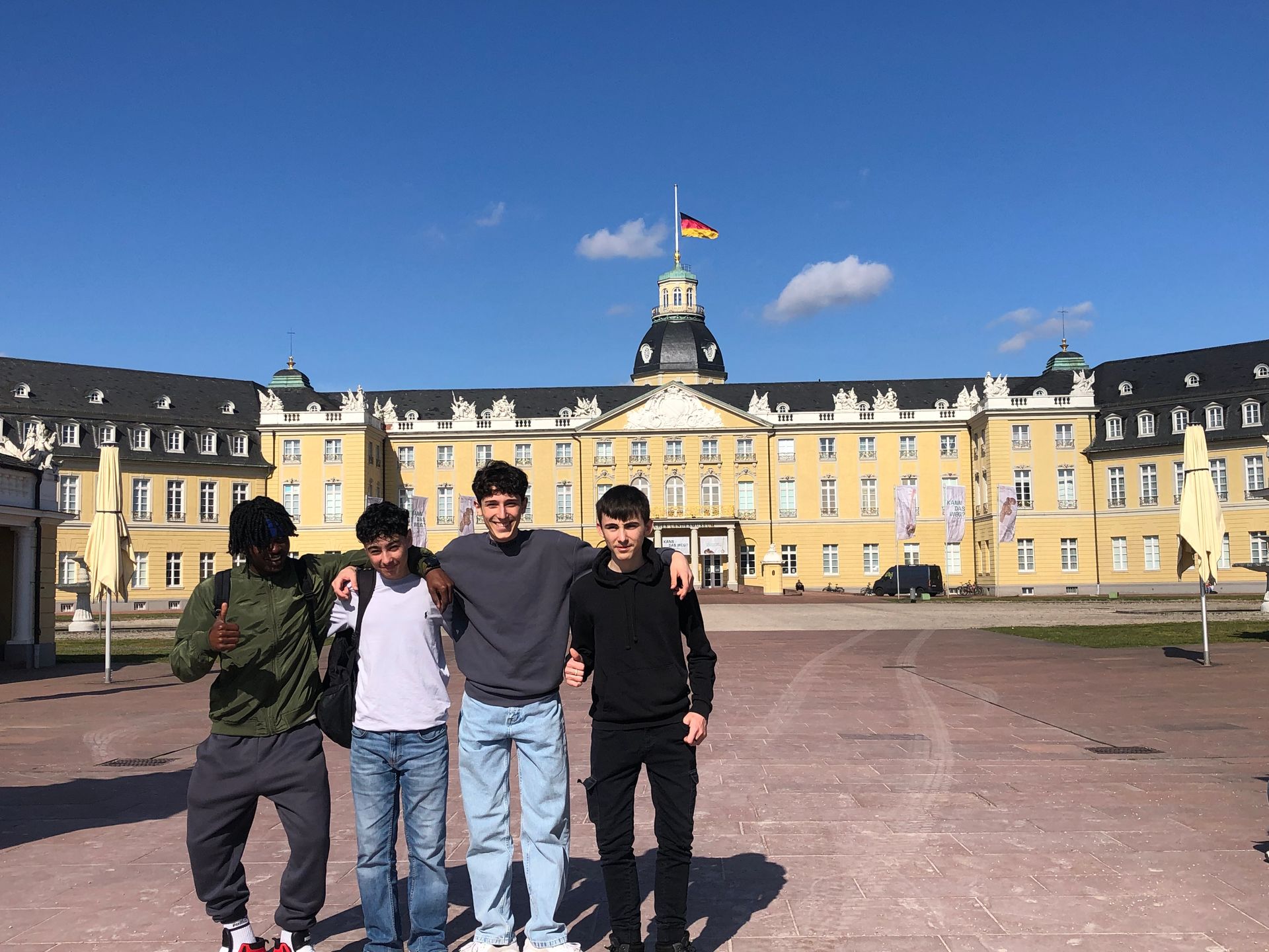 Treffpunkt Staatstheater! Am Morgen machen wir eine Führung der großen Bühne und hinter die Kulissen z.B. in die Maske und die riesige Kleiderkammer, den Malersaal und die Werkstätten. Zum Mittagssnack und einer Videoshow sind wir ins Karlsruher Rathaus auf dem Marktplatz eingeladen. Bei strahlendem Sonnenschein steuern wir auf das Schloss zu, machen Fotos mit den Statuen im Park, steigen auf den Schlossturm und haben ein tolles Panorama auf die Fächerstadt. Der Nachmittag ist zur freien Gestaltung, am Abend beindruckt uns eine moderne Tanzdarbietung im Staatstheater.