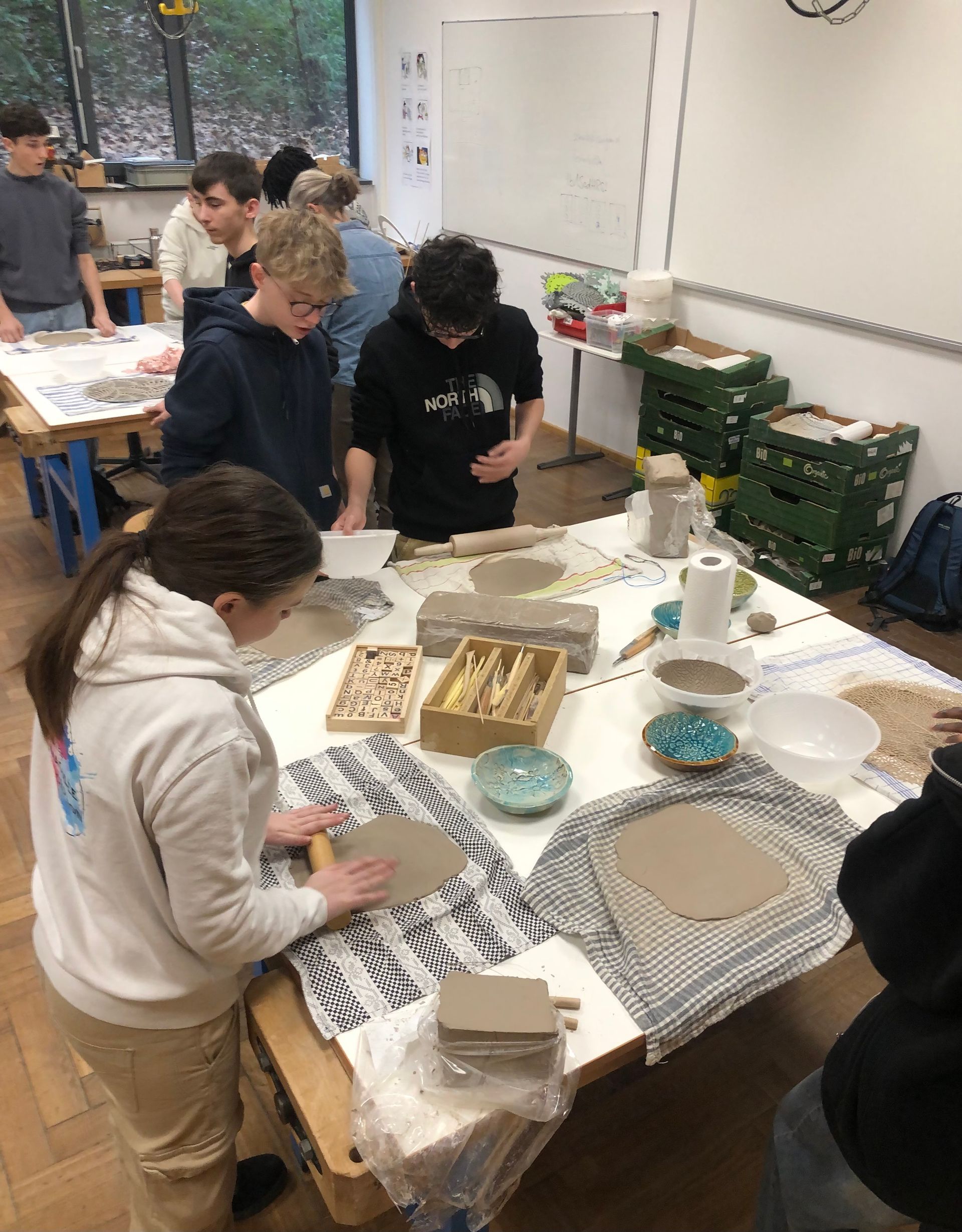 Heute begleiten uns unsere französischen Gäste in den Unterricht, nachdem wir zunächst gemeinsam mit Frau Berger Schalen aus Ton getöpfert haben. Diese werden wir später noch brennen und lasieren und unseren Austauschpartner:innen mitbringen. Zum Mittagessen geht es in die Kantine nebenan und am Nachmittag zu einem KI-Kunst-Workshop ins ZKM.