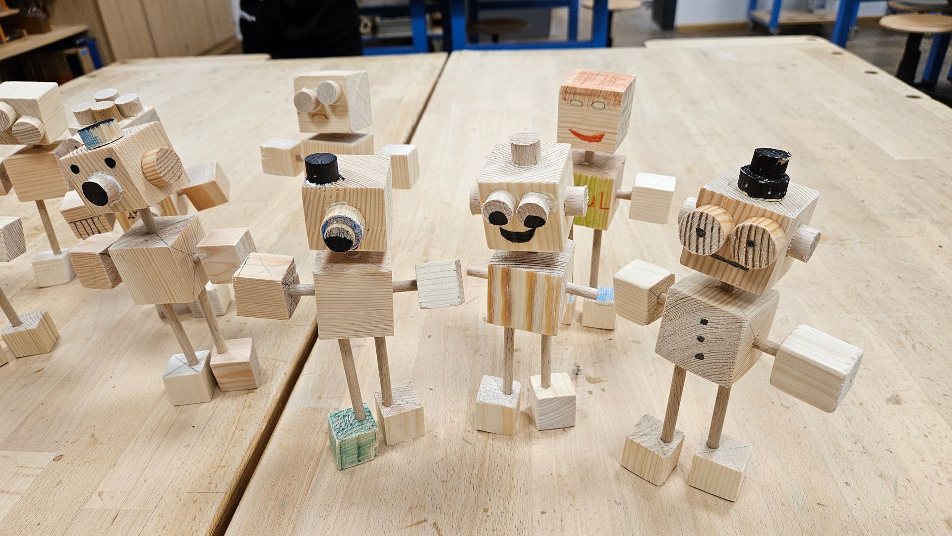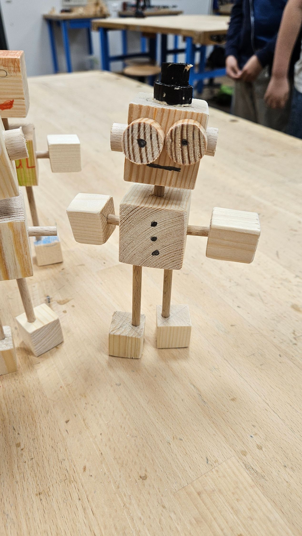 Dafür wurde an einen Schnuppertag die Schulbank gegen die Werkbank getauscht. Es wurde markiert, gesägt, gefeilt, geschliffen, gebohrt, geleimt und gemalt. Heraus kamen sehr schöne Holz-Roboter. Seht selbst.