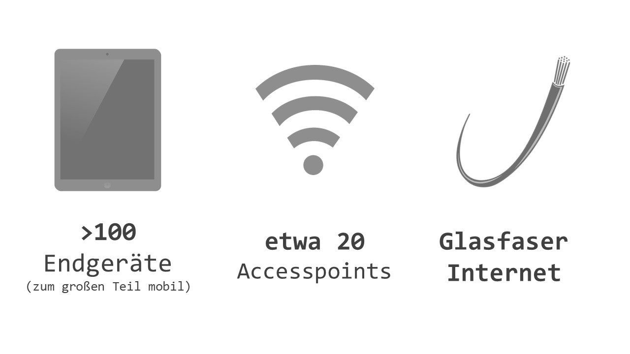 Die Grundlage für funktionierende digitale Bildung ist die Infrastruktur. Dabei ist nicht mehr "nur" der Computer-Raum von Bedeutung. Digitale Bildung passiert - dank mobiler Endgeräte - zunehmend dezentral. Mit über 100 zum großen Teil mobilen Endgeräten, schulweitem WLAN und Glasfaser-Internet sind wir in dieser Hinsicht grundsolide aufgestellt.