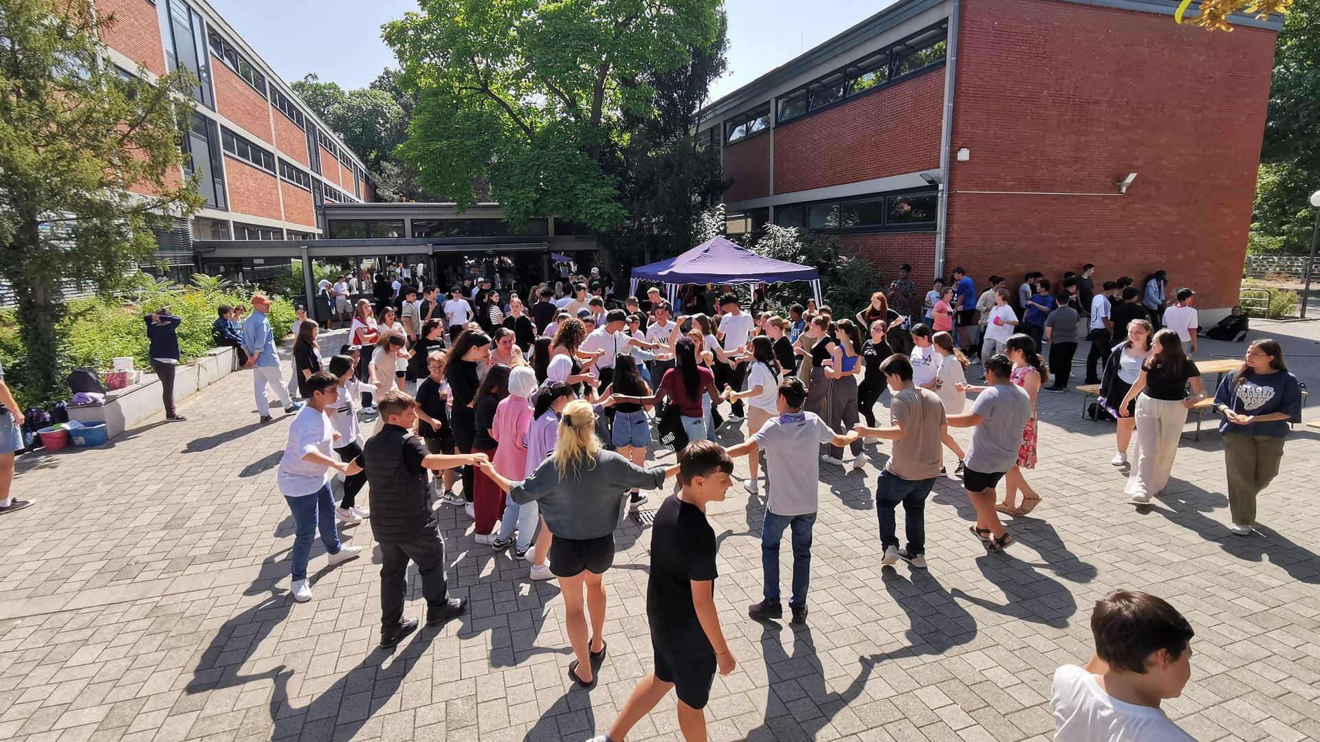 Juli 2023 - Sommerfest auf dem Schulhof mit Erfrischungen, Musik, Tanz, Spielen und ausgelassenem Feiern.
