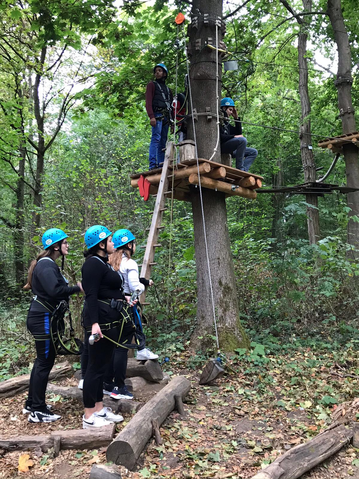 Anschließend ging es über einen kleinen Spazierweg im Wald zum Waldseilpark, der mit seinen 12 verschiedenen Parcours in unterschiedlichen Höhen viele spannende Herausforderungen bot. Trotz eines mäßigen bis hohen Adrenalinspiegels, der die Knie mit einem kurzen Blick nach oben weich werden lassen könnte, fassten viele Schülerinnen und Schüler den Mut, der Höhe entschlossen entgegenzutreten. Nach einer kurzen Einweisung ging es auch schon los. Einige trauten sich bereits zu Beginn an die schweren Parcours und andere konnten ihre Angst nach einer gewissen Eingewöhnungsphase bezwingen, woraufhin sie gleichermaßen bereit waren, immer weiter in die Höhe zu steigen. Besonders der schwarze und der braune Parcours, die vom Kletterer einiges an Kraft und besonders Mut abverlangten, stellte einen besonderen Anreiz für einige Schülerinnen und Schüler dar. Die Höhenangst schien über den Tag hinweg verflogen und der Spaß an der Herausforderung wuchs im Laufe des Tages immer weiter an.