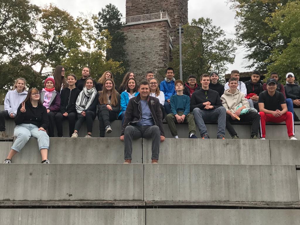 Nach einer kurzen Fahrt mit der Stadtbahn kamen die Klassen in Durlach an. Gemeinsam erklommen alle Schülerinnen und Schüler die 528 Stufen, die zum Aussichtpunkt des Turmbergs führen. Der anstrengende Aufstieg wurde von allen bravourös gemeistert und im Gegenzug mit einer atemberaubenden Aussicht über Karlsruhe entlohnt.