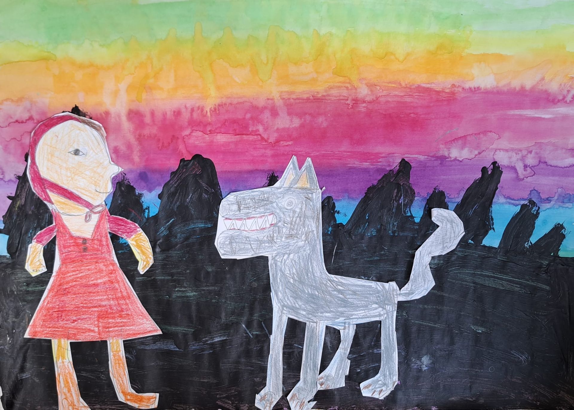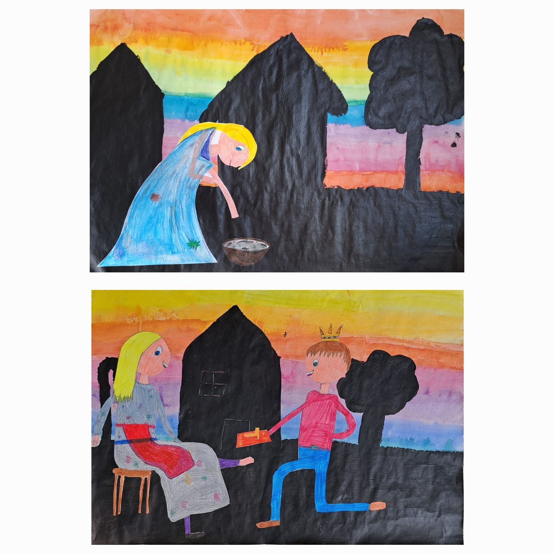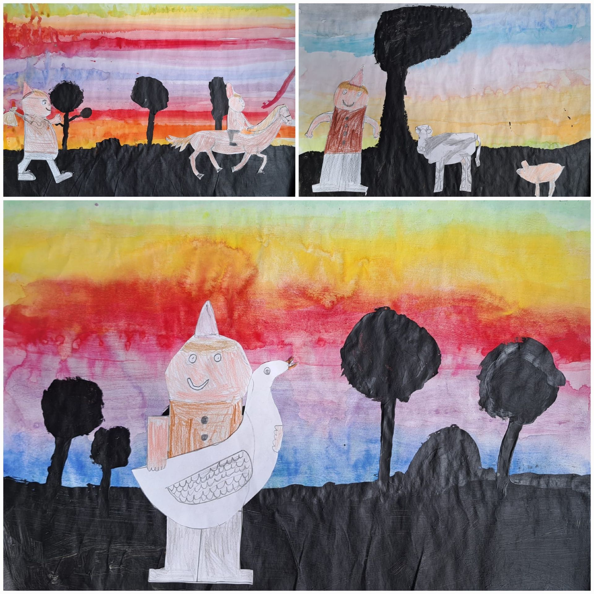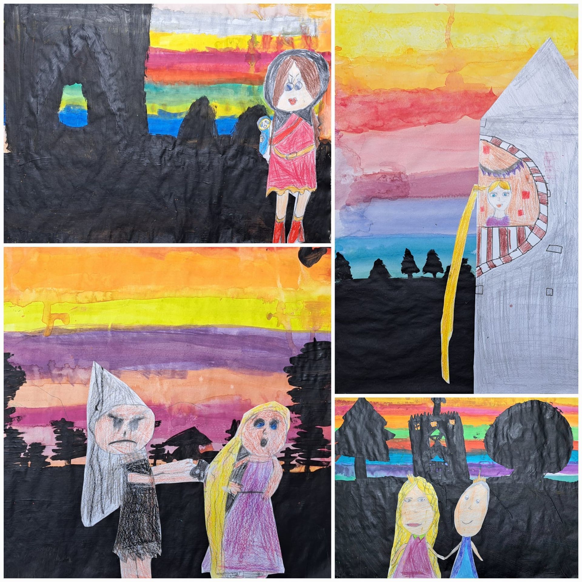 Am Projekttag wurden dann die Märchen vorgelesen und aufgenommen und außerdem Bilder zu verschiedenen Szenen aus den ausgewählten Märchen gestaltet.
