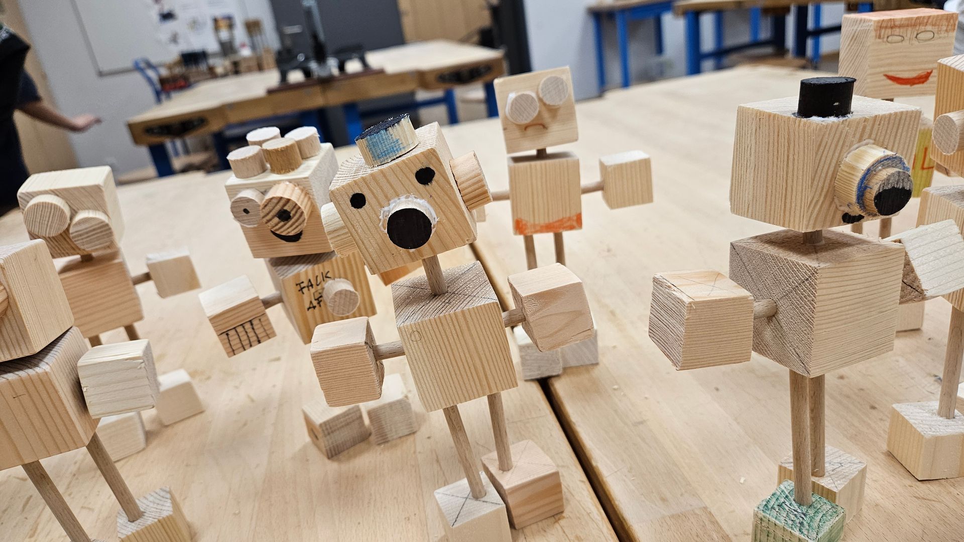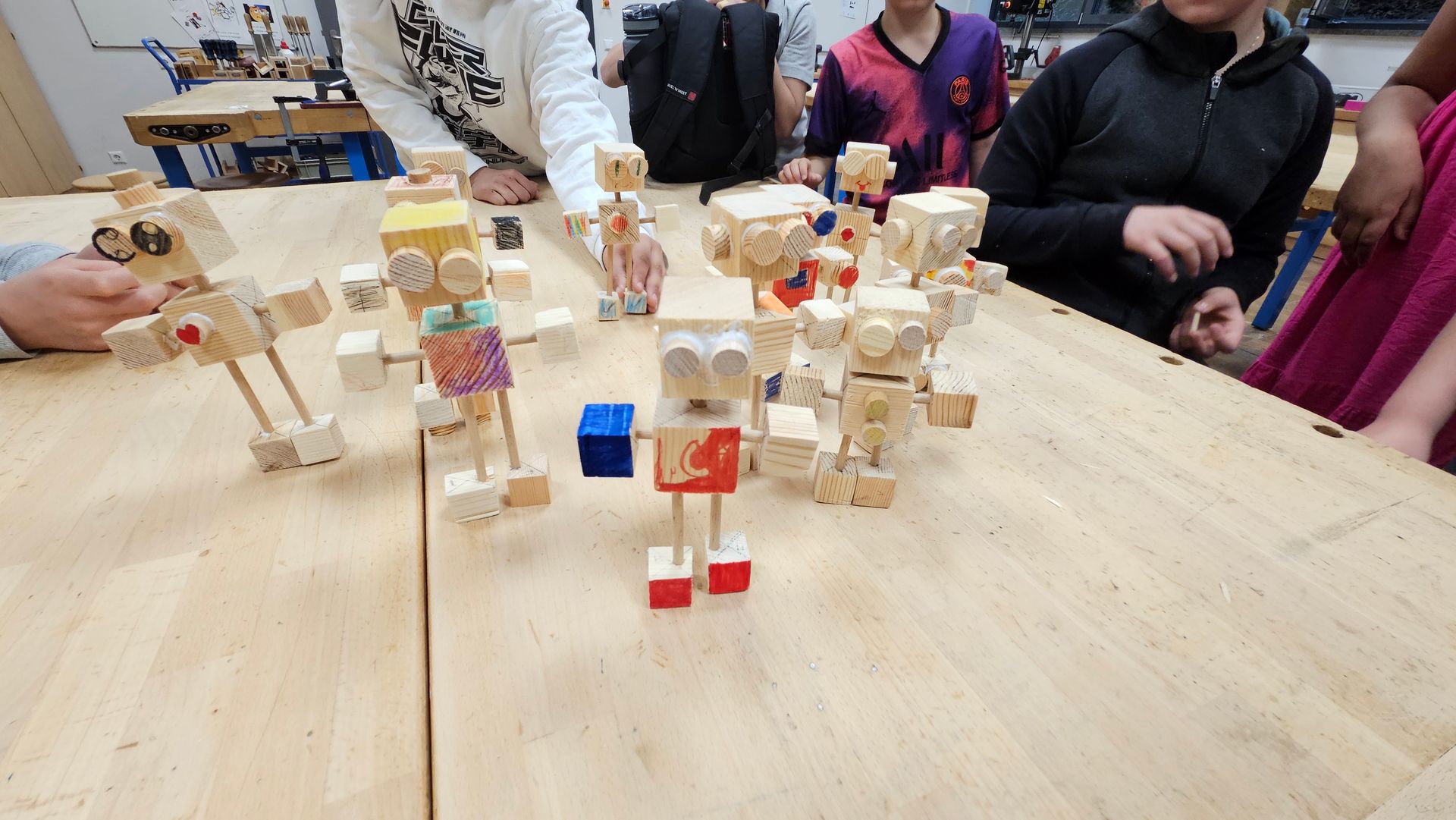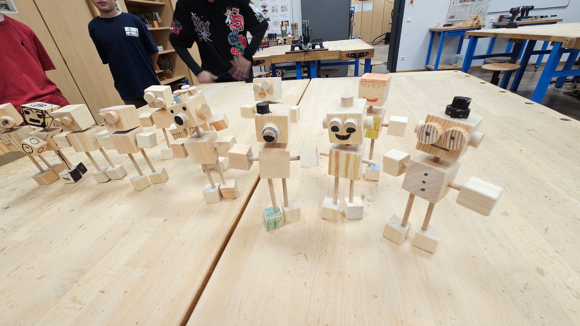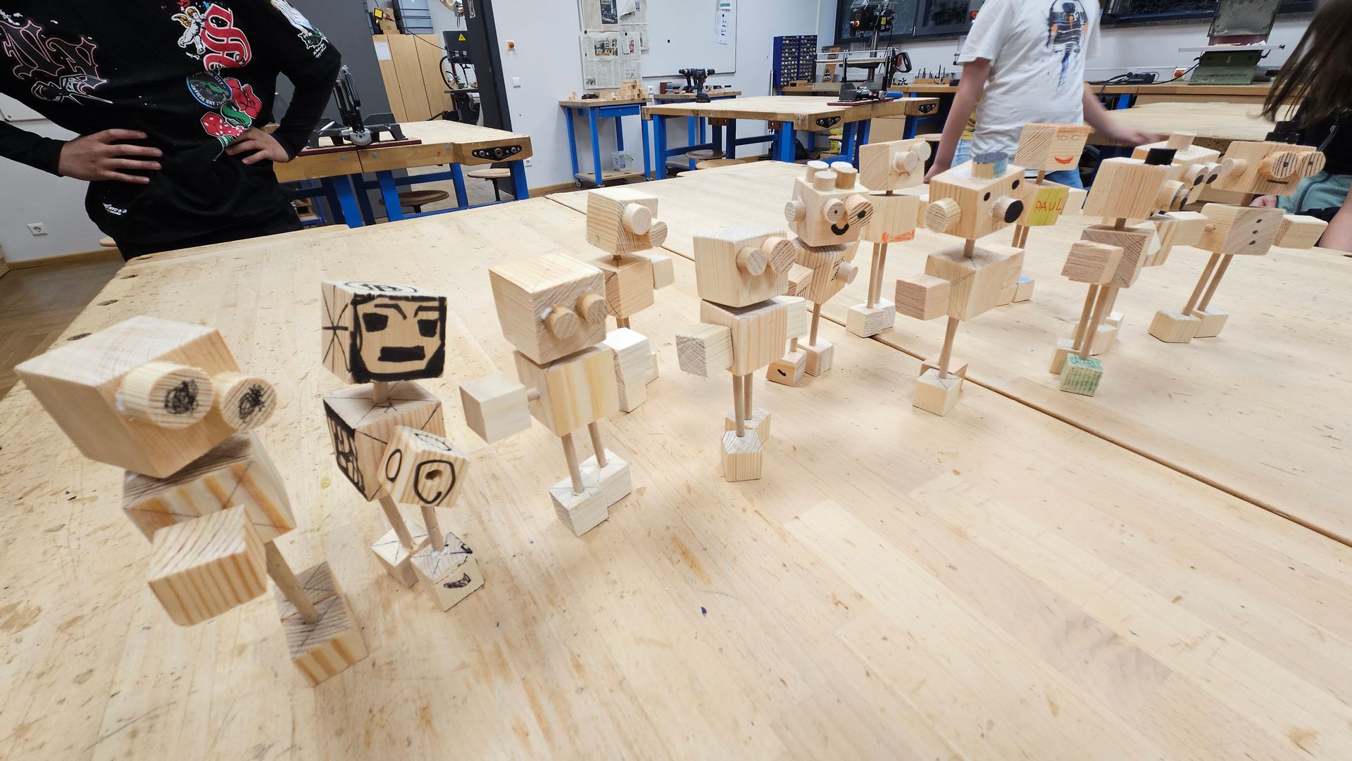 Dafür wurde an einen Schnuppertag die Schulbank gegen die Werkbank getauscht. Es wurde markiert, gesägt, gefeilt, geschliffen, gebohrt, geleimt und gemalt. Heraus kamen sehr schöne Holz-Roboter. Seht selbst.