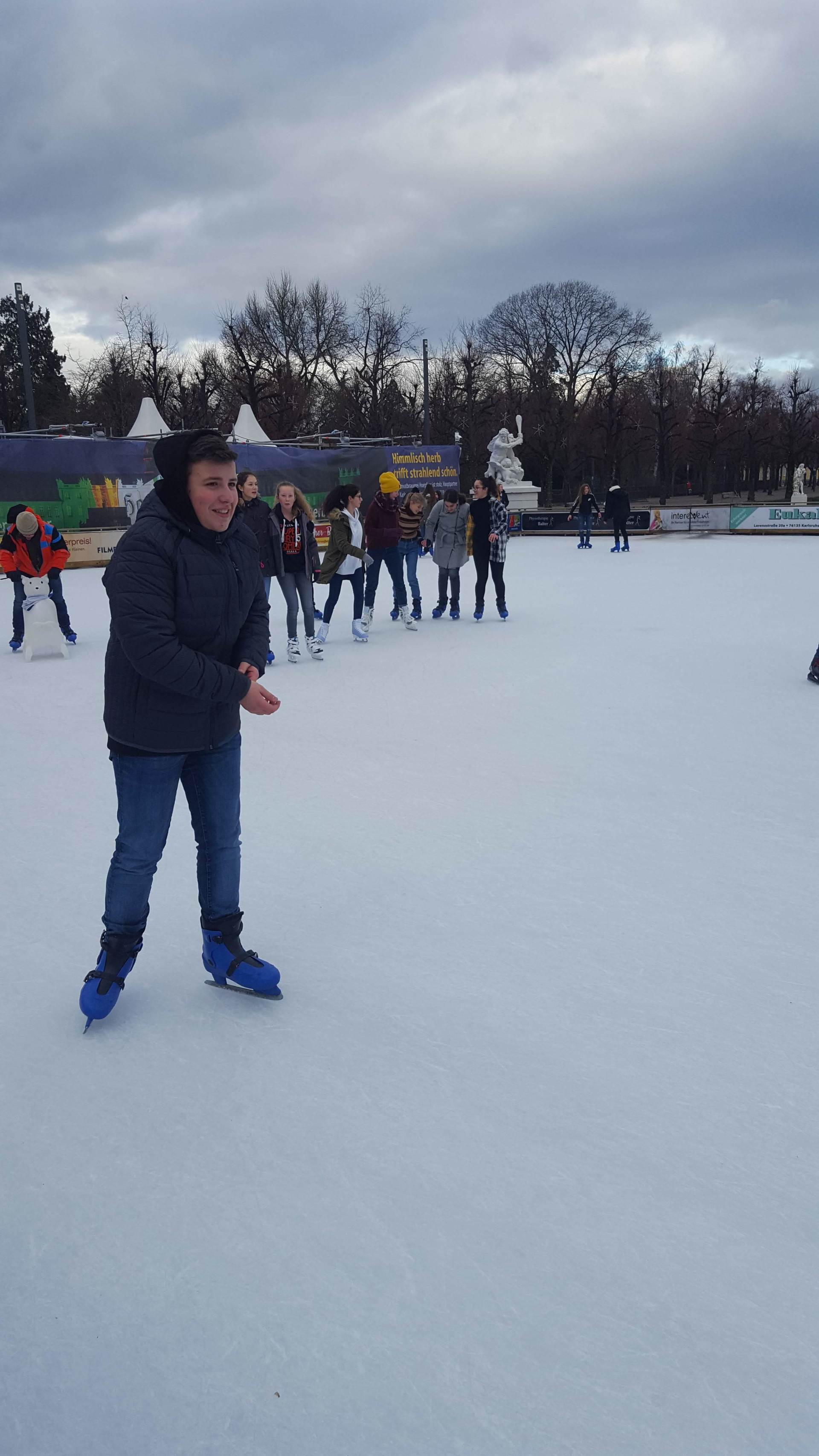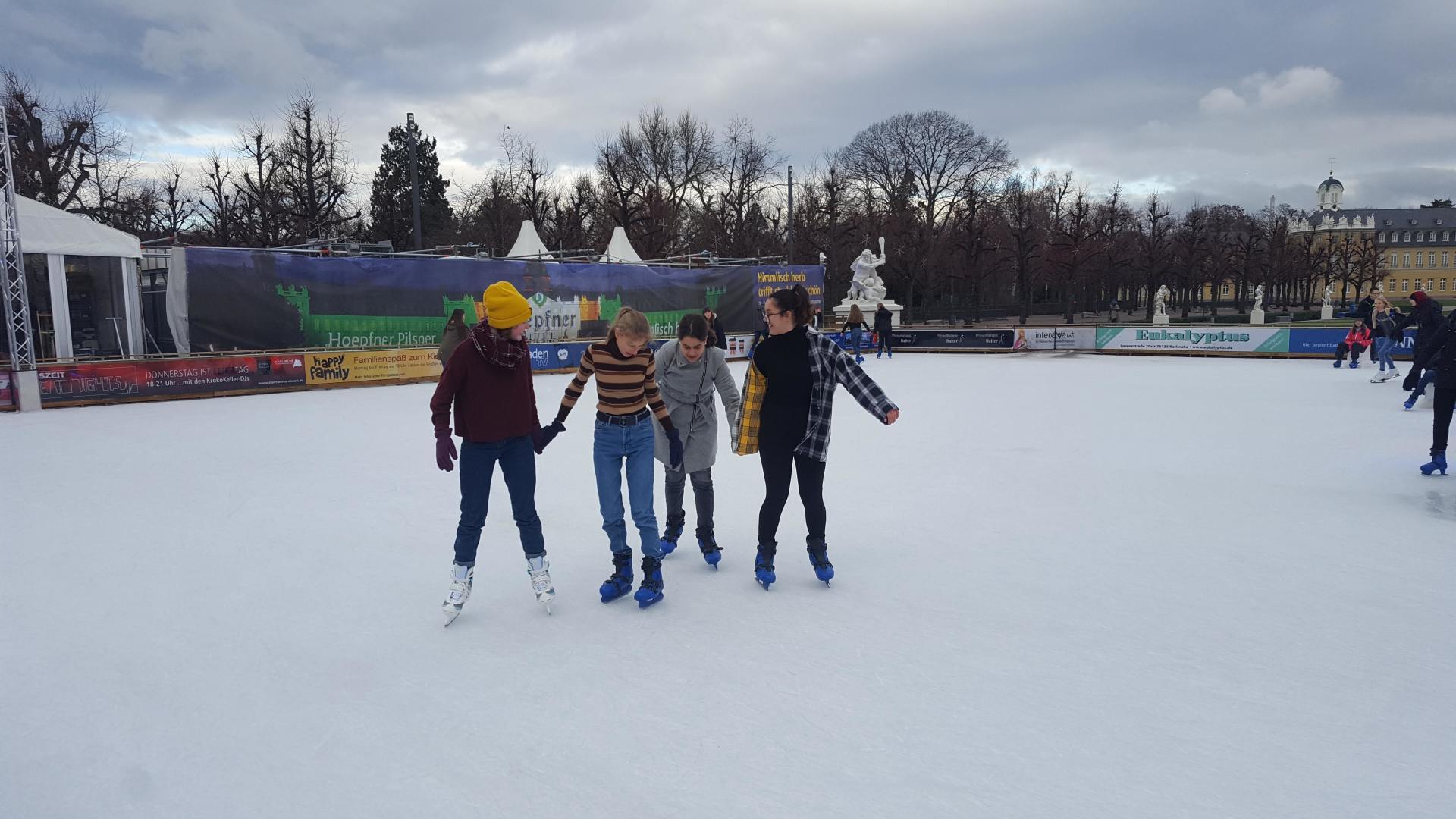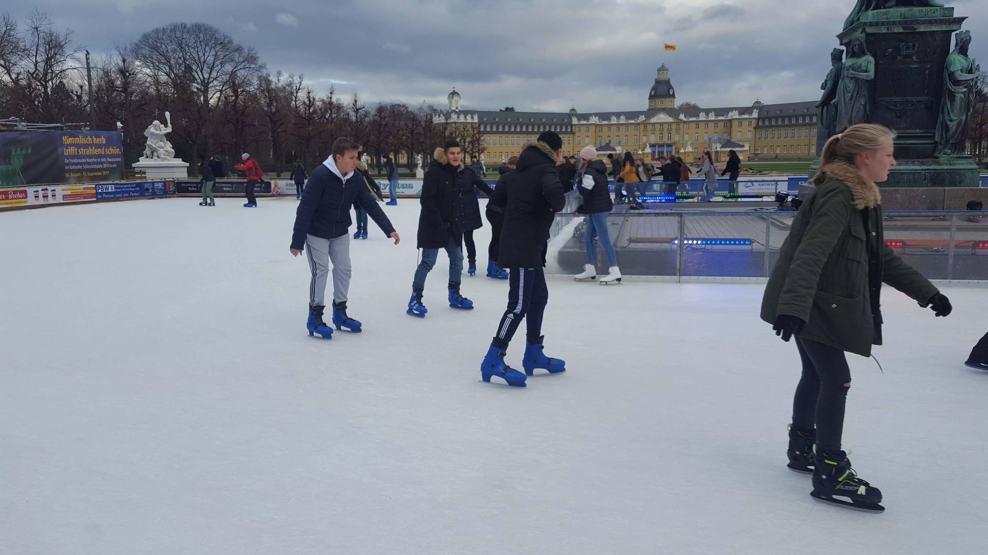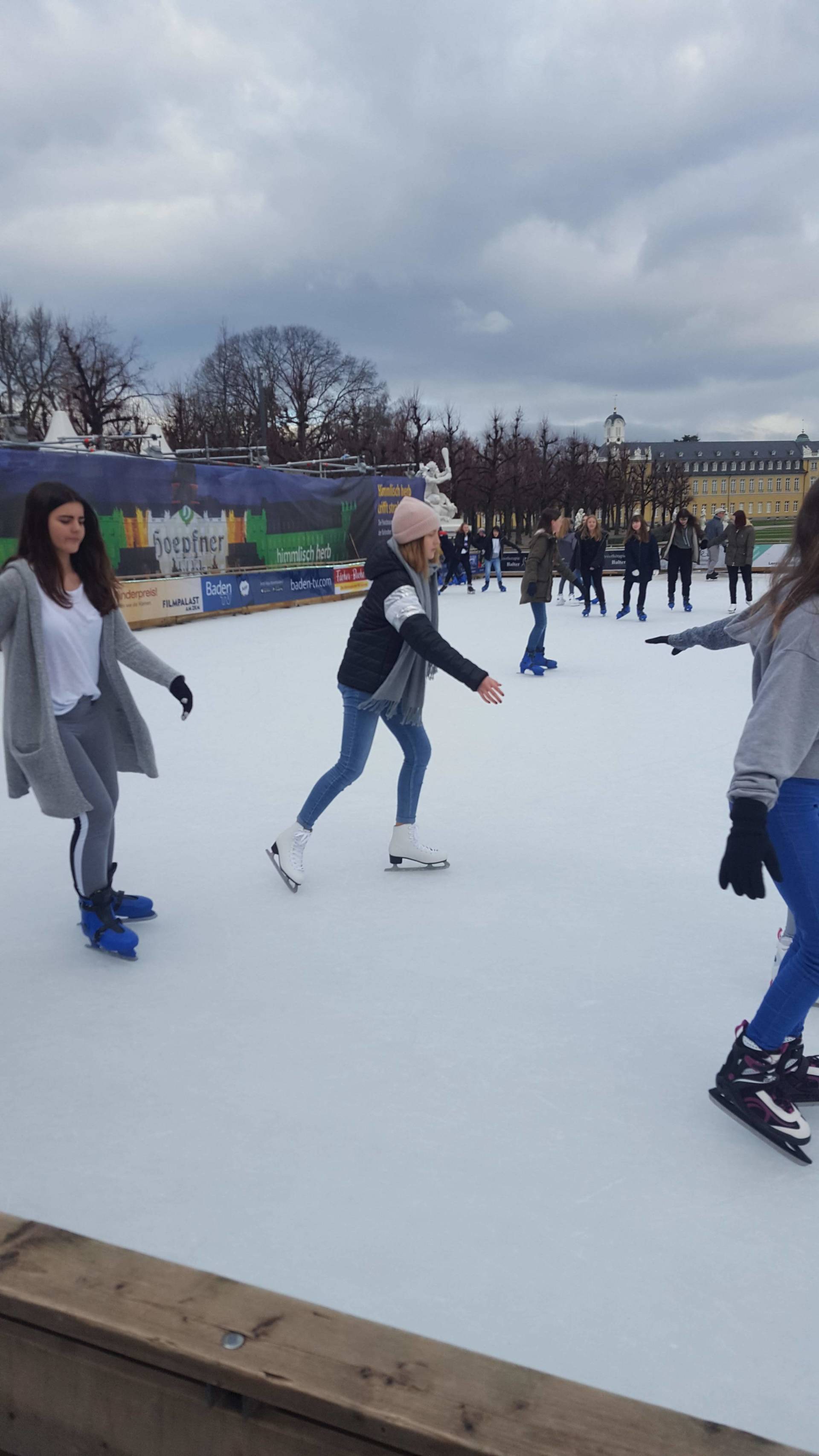 Januar 2019 - Was für eine gelungene Aktion! Am Montag, den 14.1., wurden die Hefte und Stifte aller Achtklässler schon etwas früher als sonst in den Schulranzen gepackt. Anstatt die Schulbank zu drücken, ging es in der 5. und 6. Stunde aufs Eis. Keine 10 Minuten von unserer Schule entfernt fand die Eiszeit vor malerischer Kulisse - dem Schloss - statt. Da lassen wir uns nicht zweimal bitten. Knapp 80 Schülerinnen und Schüler waren dabei und die meisten schnallten sich auch Schlittschuhe um =). Zwischenzeitlich kam - an dem sonst so düsteren Tag - sogar die Sonne heraus. Es wundert nicht, dass es ein rundum gelungener Kurzausflug mit ausgelassener Stimmung war.