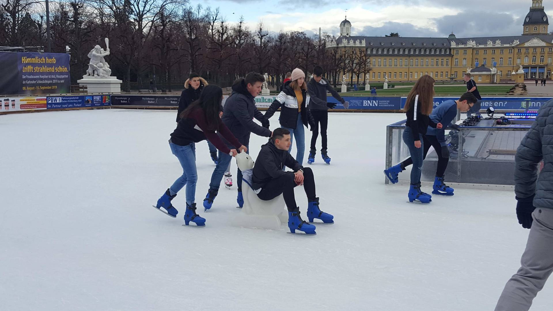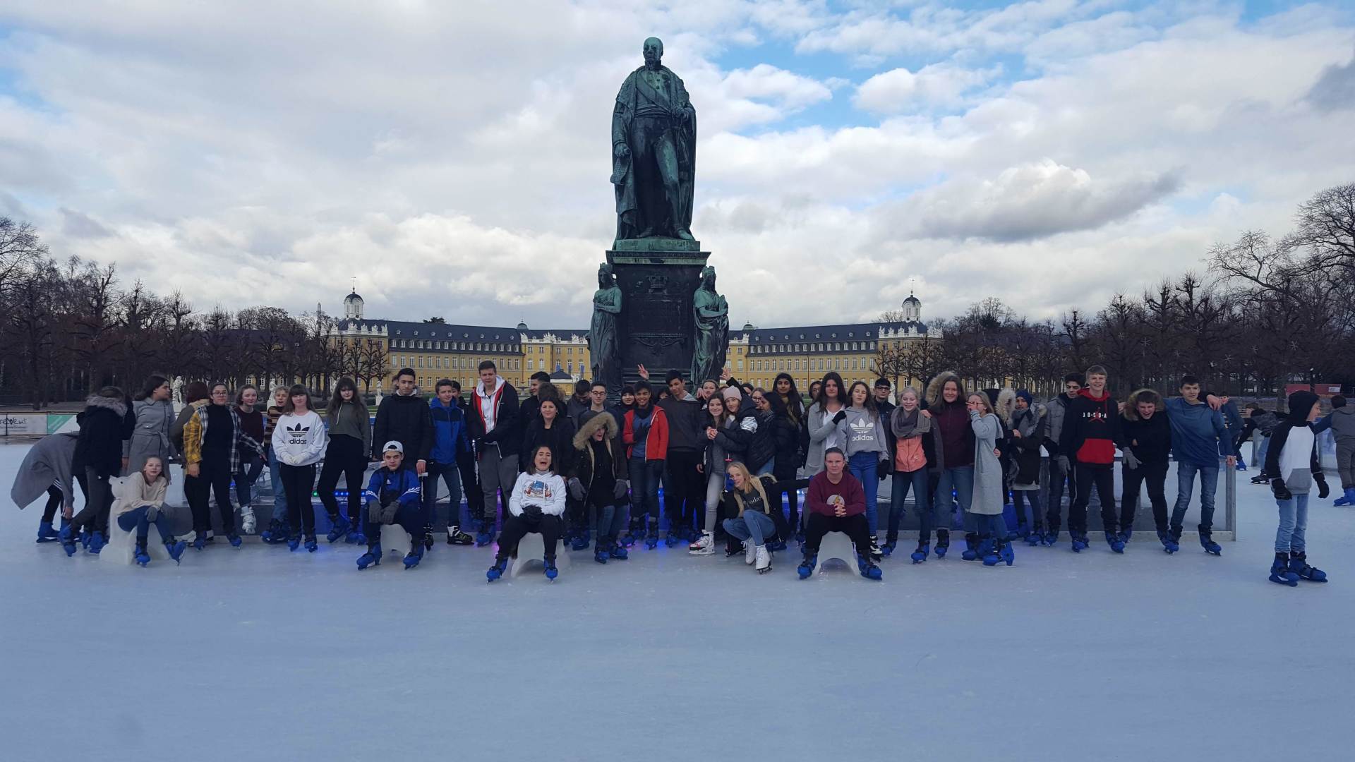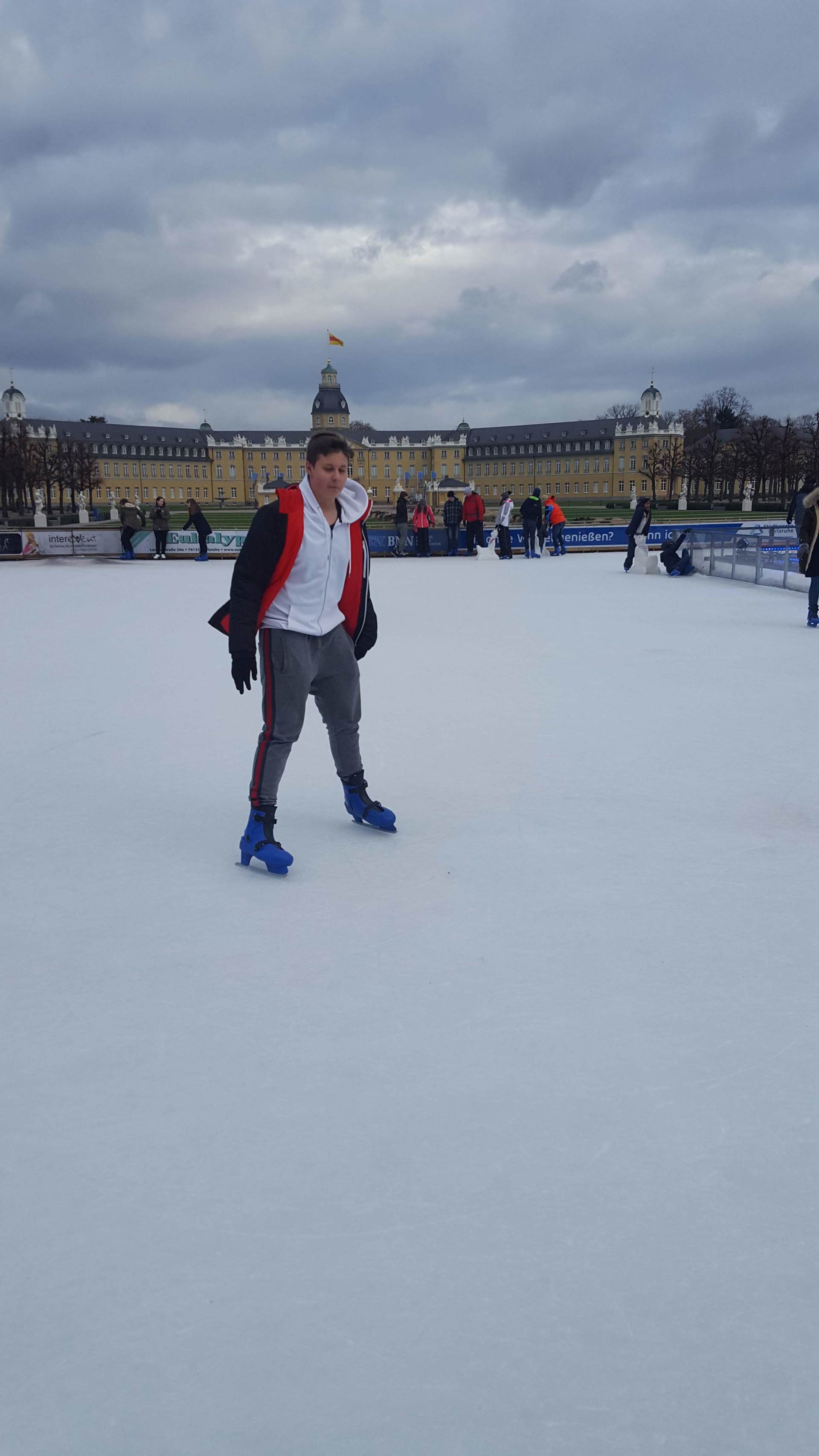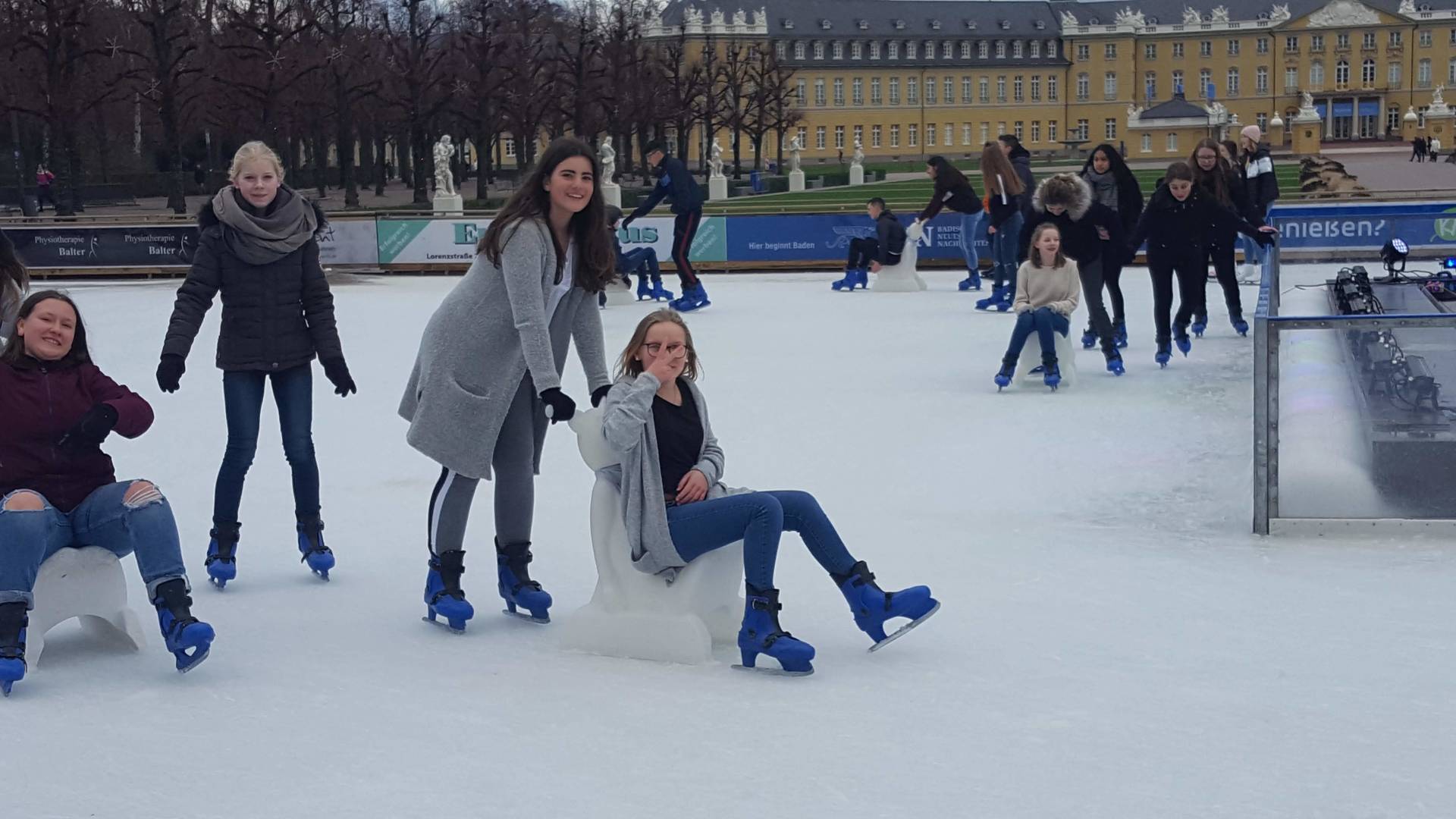 Januar 2019 - Was für eine gelungene Aktion! Am Montag, den 14.1., wurden die Hefte und Stifte aller Achtklässler schon etwas früher als sonst in den Schulranzen gepackt. Anstatt die Schulbank zu drücken, ging es in der 5. und 6. Stunde aufs Eis. Keine 10 Minuten von unserer Schule entfernt fand die Eiszeit vor malerischer Kulisse - dem Schloss - statt. Da lassen wir uns nicht zweimal bitten. Knapp 80 Schülerinnen und Schüler waren dabei und die meisten schnallten sich auch Schlittschuhe um =). Zwischenzeitlich kam - an dem sonst so düsteren Tag - sogar die Sonne heraus. Es wundert nicht, dass es ein rundum gelungener Kurzausflug mit ausgelassener Stimmung war.