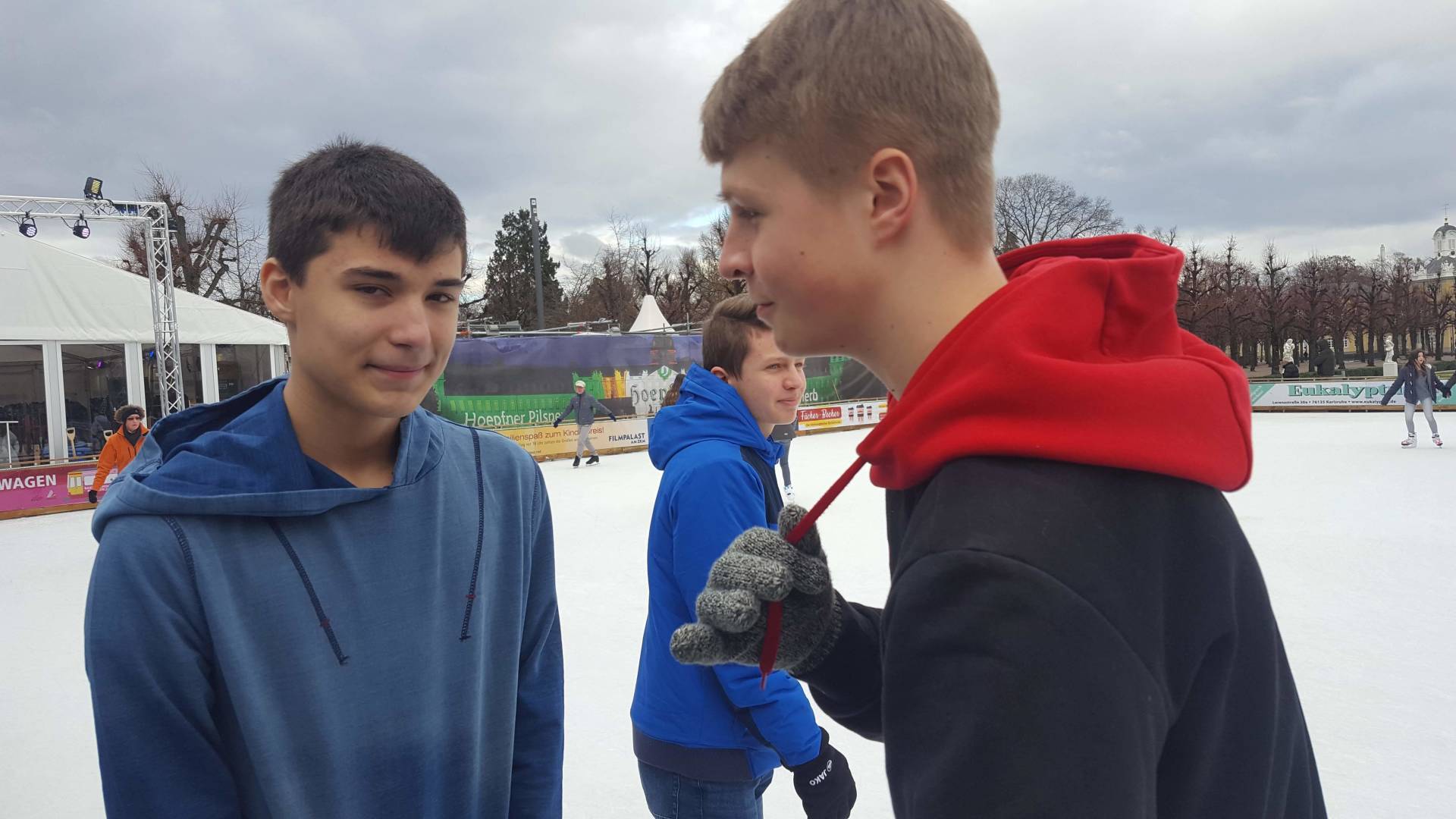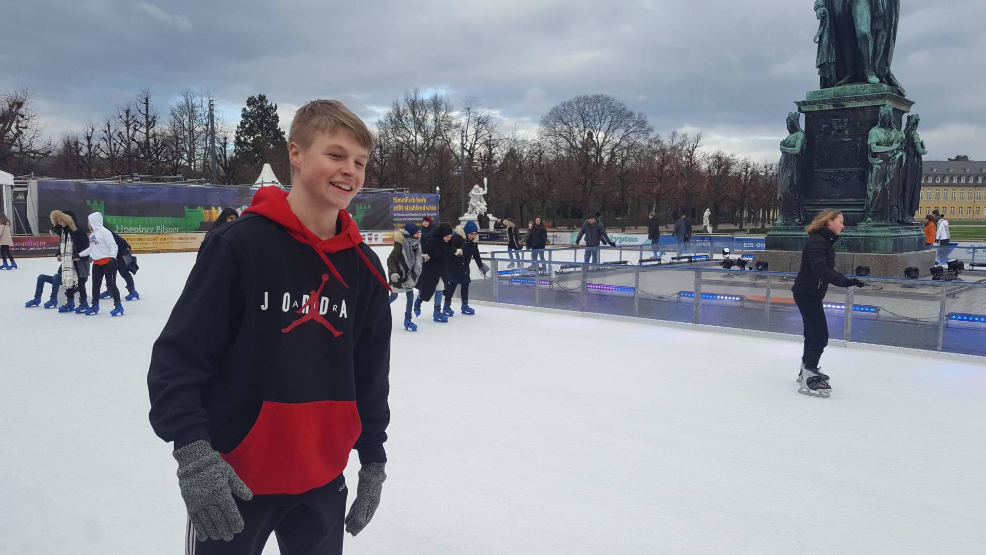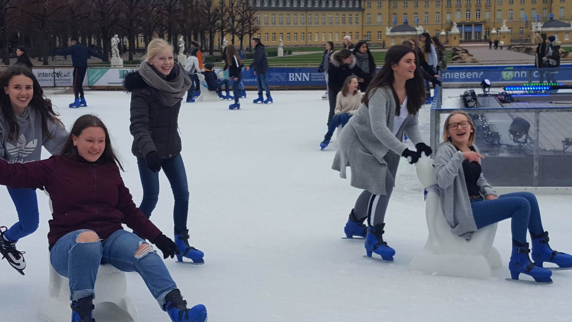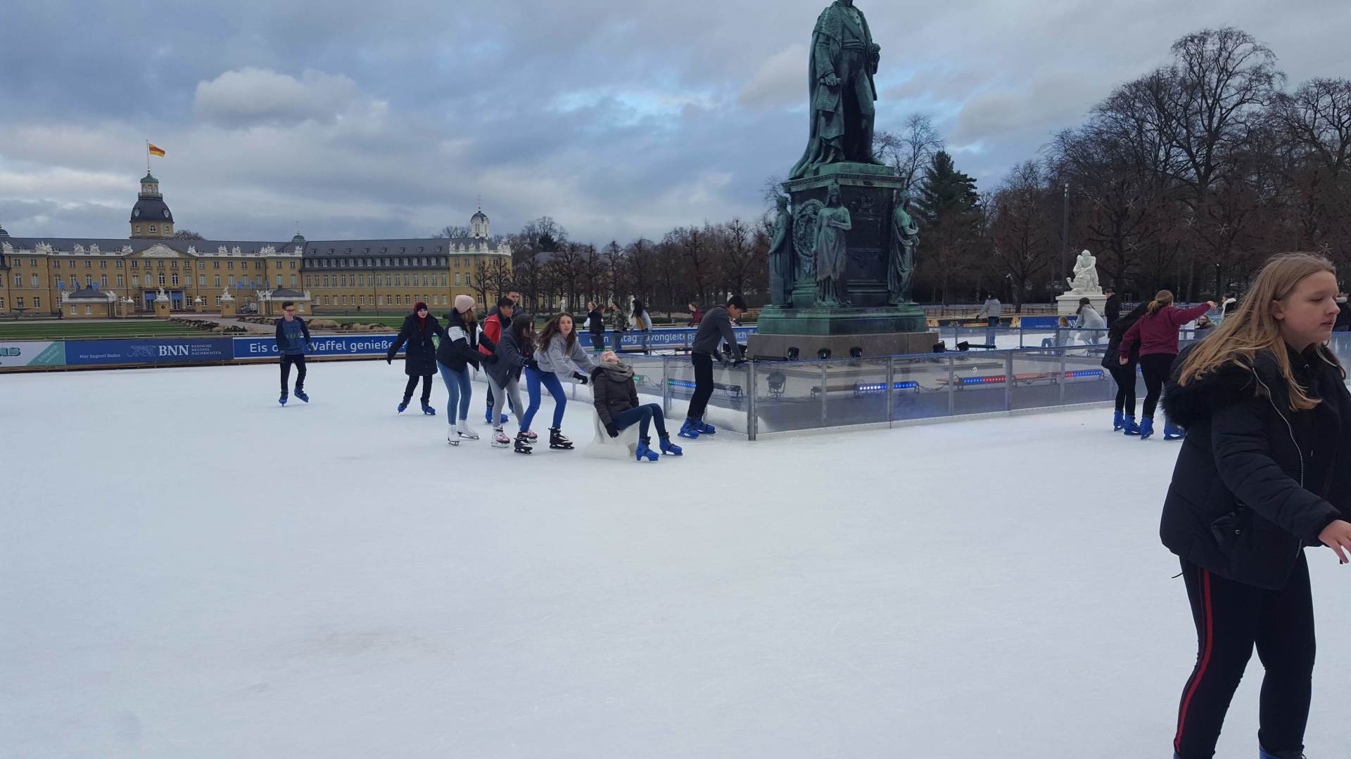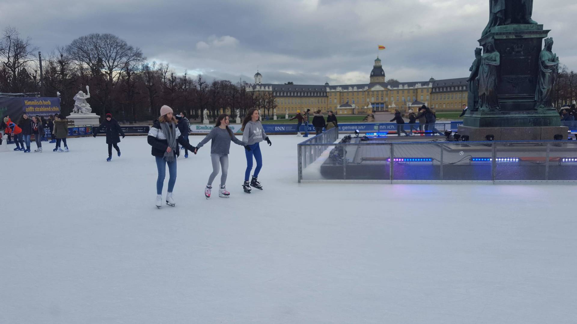 Januar 2019 - Was für eine gelungene Aktion! Am Montag, den 14.1., wurden die Hefte und Stifte aller Achtklässler schon etwas früher als sonst in den Schulranzen gepackt. Anstatt die Schulbank zu drücken, ging es in der 5. und 6. Stunde aufs Eis. Keine 10 Minuten von unserer Schule entfernt fand die Eiszeit vor malerischer Kulisse - dem Schloss - statt. Da lassen wir uns nicht zweimal bitten. Knapp 80 Schülerinnen und Schüler waren dabei und die meisten schnallten sich auch Schlittschuhe um =). Zwischenzeitlich kam - an dem sonst so düsteren Tag - sogar die Sonne heraus. Es wundert nicht, dass es ein rundum gelungener Kurzausflug mit ausgelassener Stimmung war.