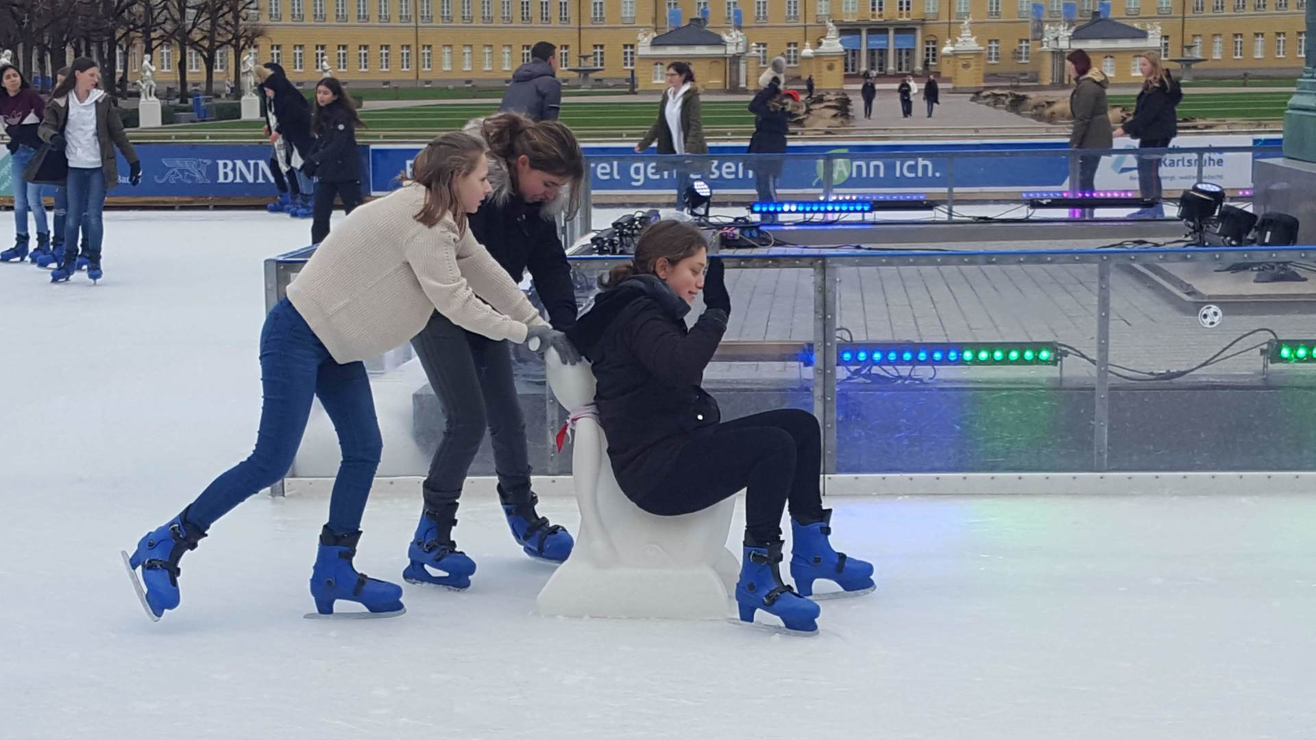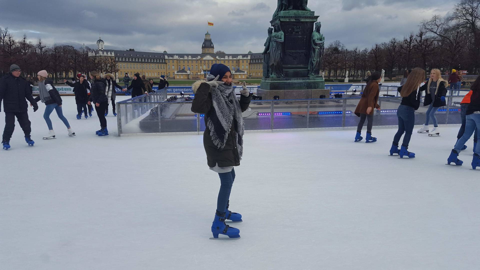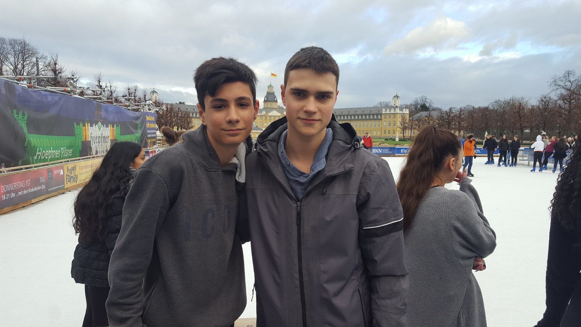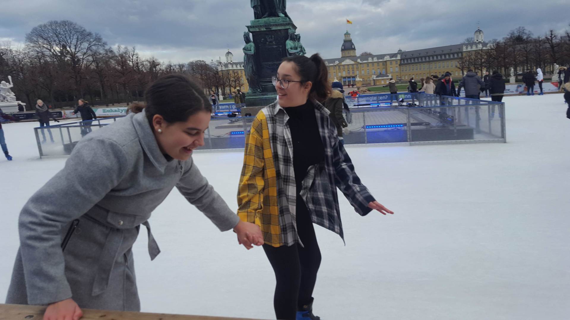 Januar 2019 - Was für eine gelungene Aktion! Am Montag, den 14.1., wurden die Hefte und Stifte aller Achtklässler schon etwas früher als sonst in den Schulranzen gepackt. Anstatt die Schulbank zu drücken, ging es in der 5. und 6. Stunde aufs Eis. Keine 10 Minuten von unserer Schule entfernt fand die Eiszeit vor malerischer Kulisse - dem Schloss - statt. Da lassen wir uns nicht zweimal bitten. Knapp 80 Schülerinnen und Schüler waren dabei und die meisten schnallten sich auch Schlittschuhe um =). Zwischenzeitlich kam - an dem sonst so düsteren Tag - sogar die Sonne heraus. Es wundert nicht, dass es ein rundum gelungener Kurzausflug mit ausgelassener Stimmung war.